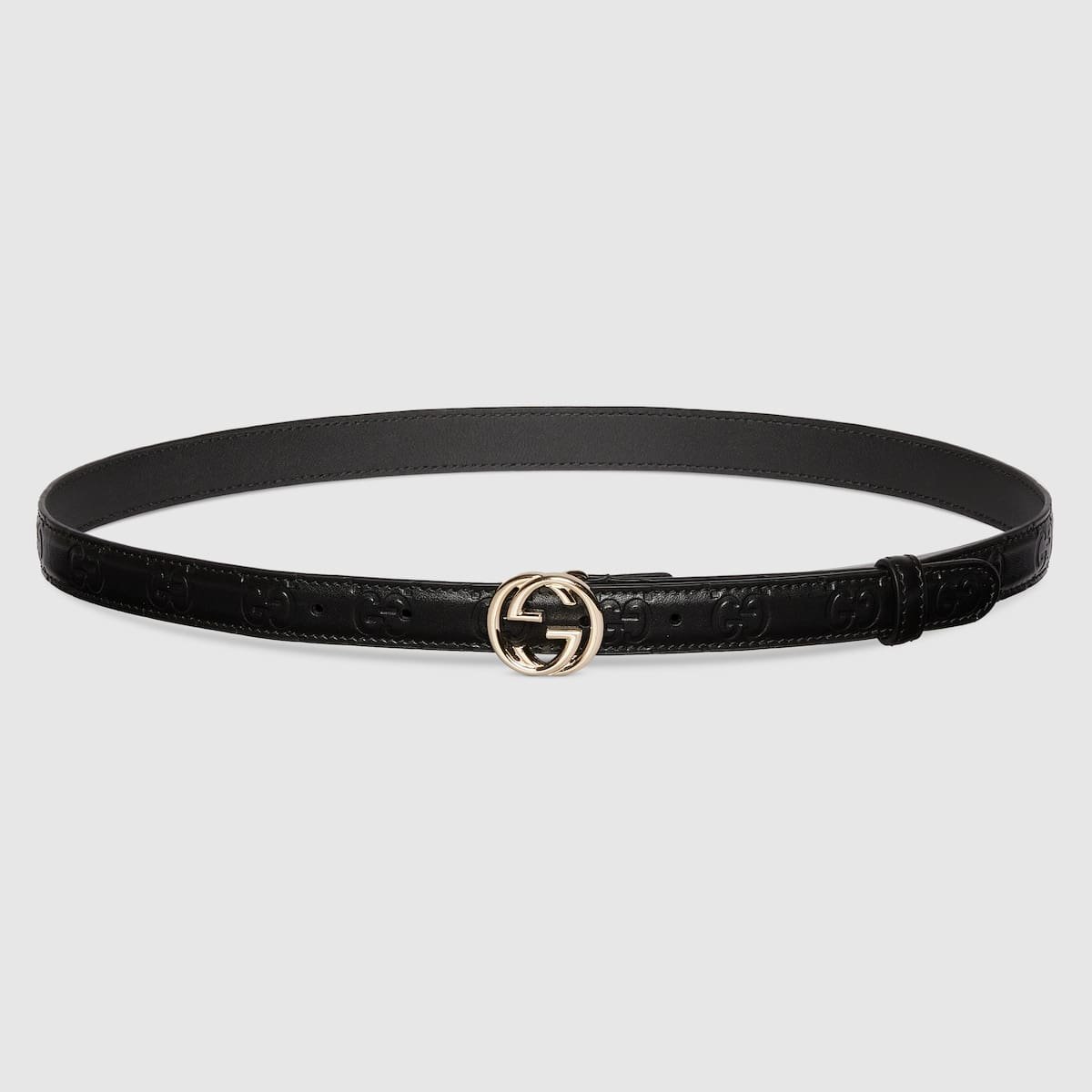 The emblematic GG motif continues to decorate leather accessories, connecting contemporary pieces to the heritage of the House. The monogram defines this belt crafted from black GG embossed leather with a soft and silky touch. The Interlocking G buckle completes the accessory with a unique feel.