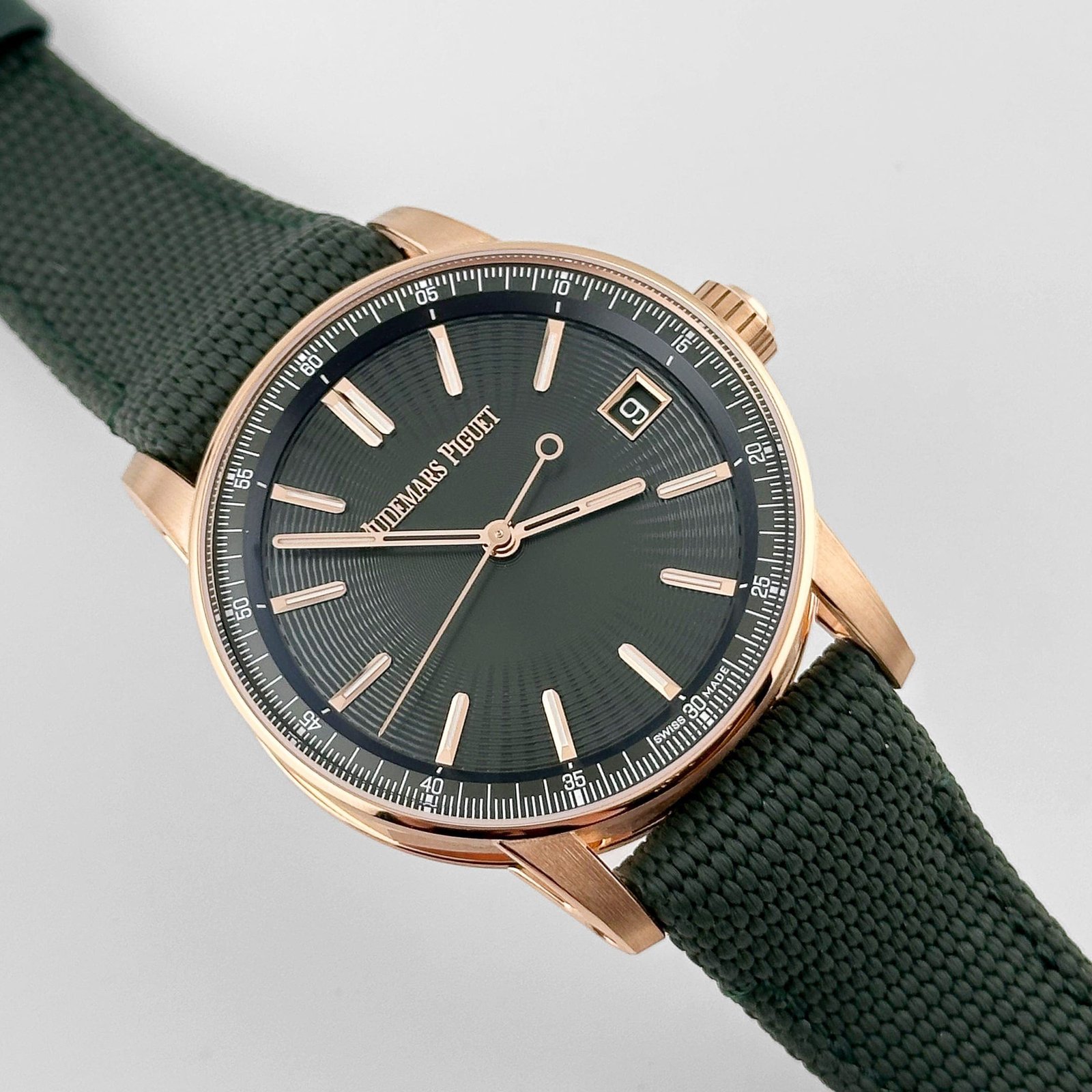 The green lacquered dial features a sunburst pattern that shifts beautifully with the light, complemented by applied gold hour markers and hands. Paired with a matching green strap and equipped with a date window at 3 o’clock, this automatic timepiece blends contemporary elegance with traditional craftsmanship in one of the most modern expressions of Audemars Piguet’s design ethos.