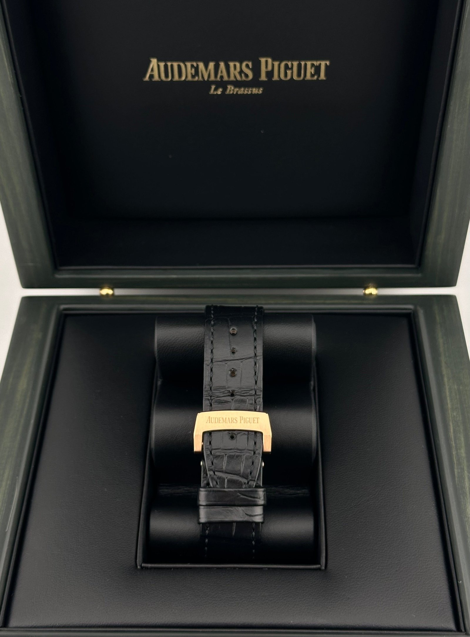 The Selfwinding is designed with an 18-carat rose gold case measuring 41mm and includes the new Royal Oak design advancement. It has a black dial with a “Grande Tapisserie” pattern, rose gold applied hour-markers and Royal Oak hands with luminescent coating, and hosts a date window at 3 o’clock. The watch comes on a black alligator strap with an 18-carat rose gold AP folding clasp.