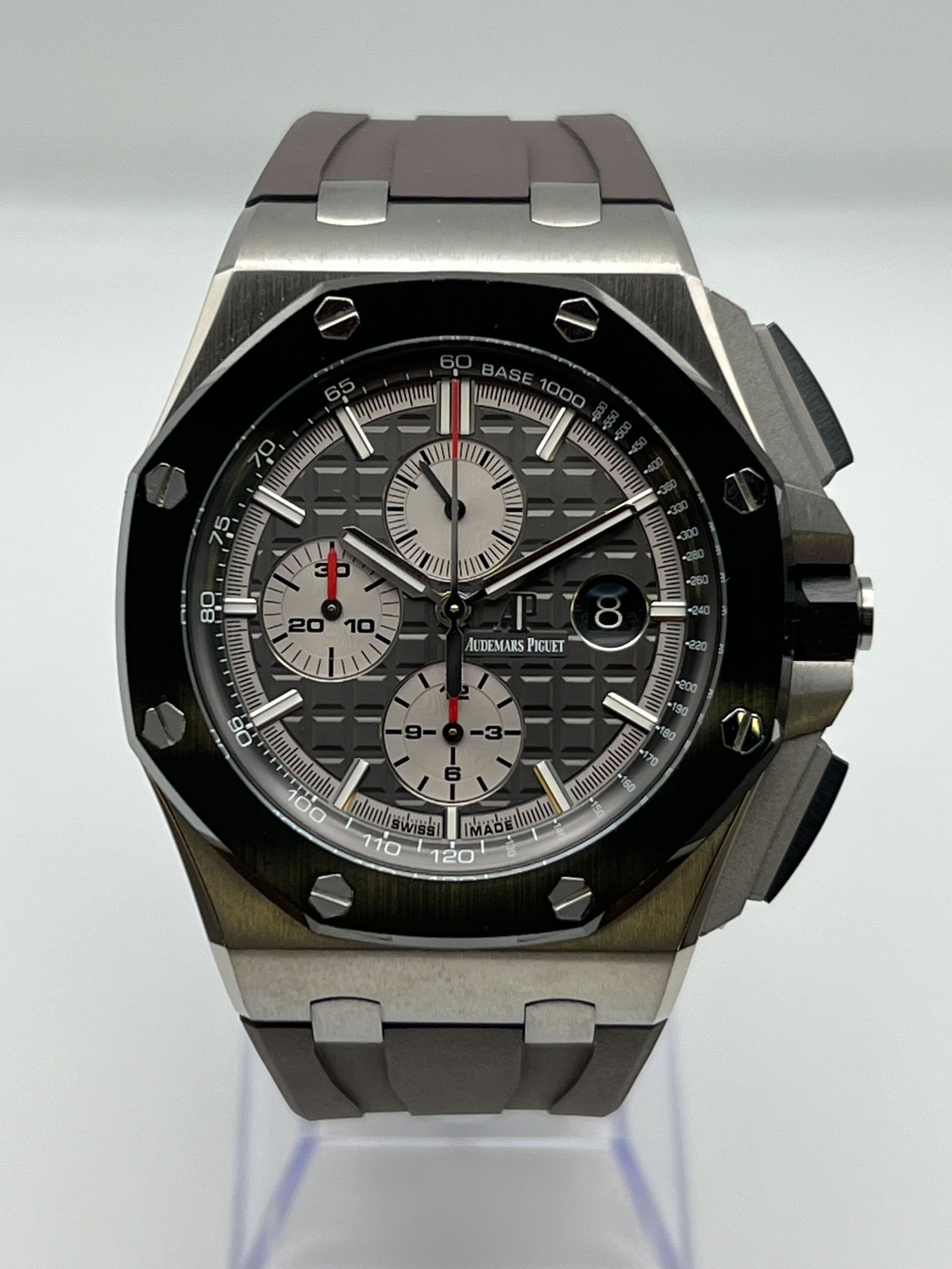 Introducing the Audemars Piguet Selfwinding 26400IO.OO.A004CA.01. The 44mm titanium case hosts a black ceramic bezel, slate dial and sub-dials with a Méga Tapisserie pattern, a date window at 3 o’clock, and a blue inner bezel ring. Luminescent white gold hand and hour markers work with the Sapphire glare-proofed crystal for optimal legibility in any condition. Styled on a grey rubber strap finished with ceramic pins for maximum comfort. Complications include chronograph, hours, minutes, small seconds, and date features.