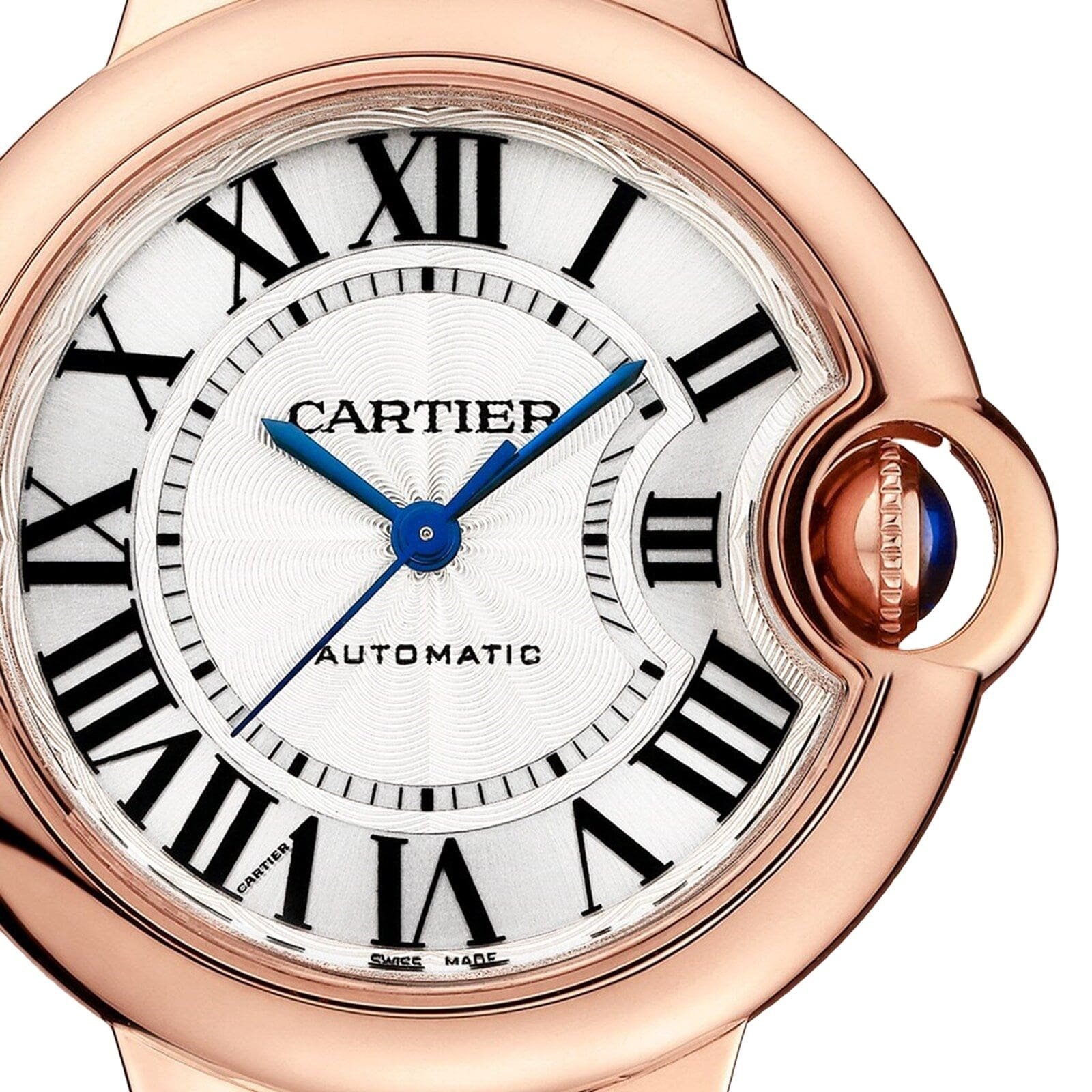 Ballon Bleu de Cartier watch, 33 mm, mechanical movement with automatic winding. Rose gold 750/1000 case and fluted crown set with a cabochon sapphire. Silver guilloché dial. Blued-steel sword-shaped hands. Sapphire crystal. Rose gold 750/1000 interchangeable bracelet. Case thickness: 10.16 mm. Water-resistant up to 3 bar (approx. 30 meters/100 feet). Floating like a balloon and as blue as the cabochon safely nestled in its side, the Ballon Bleu watch by Cartier adds a dash of elegance to male and female wrists alike. Roman numerals are guided on their path by a deep blue winding mechanism. With the convex curves of the case, guilloché dial, sword-shaped hands, and polished or satin-finish links of the bracelet…the Ballon Bleu watch by Cartier floats through the world of Cartier watchmaking.