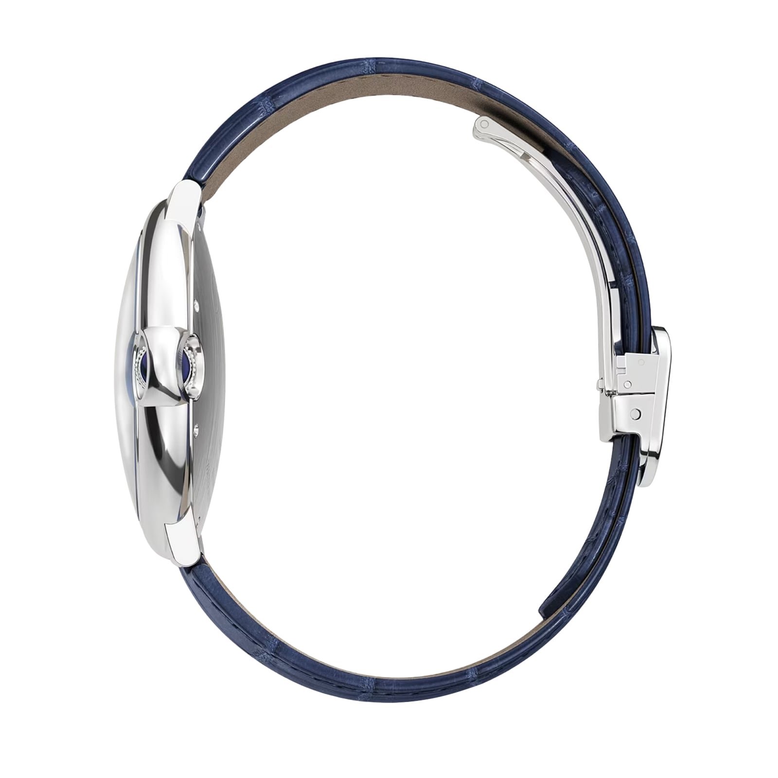 Ballon Bleu de Cartier watch, 42 mm. Mechanical movement with automatic winding, caliber 1847 MC. Steel case, fluted crown set with a cabochon synthetic spinel, blue guilloché dial. Sword-shaped hands, sapphire crystal, blue alligator leather strap, steel interchangeable deployant buckle. Calendar aperture at 3 o’clock. Thickness: 13 mm. Water-resistant up to 3 bar (approx. 30 meters/100 feet)