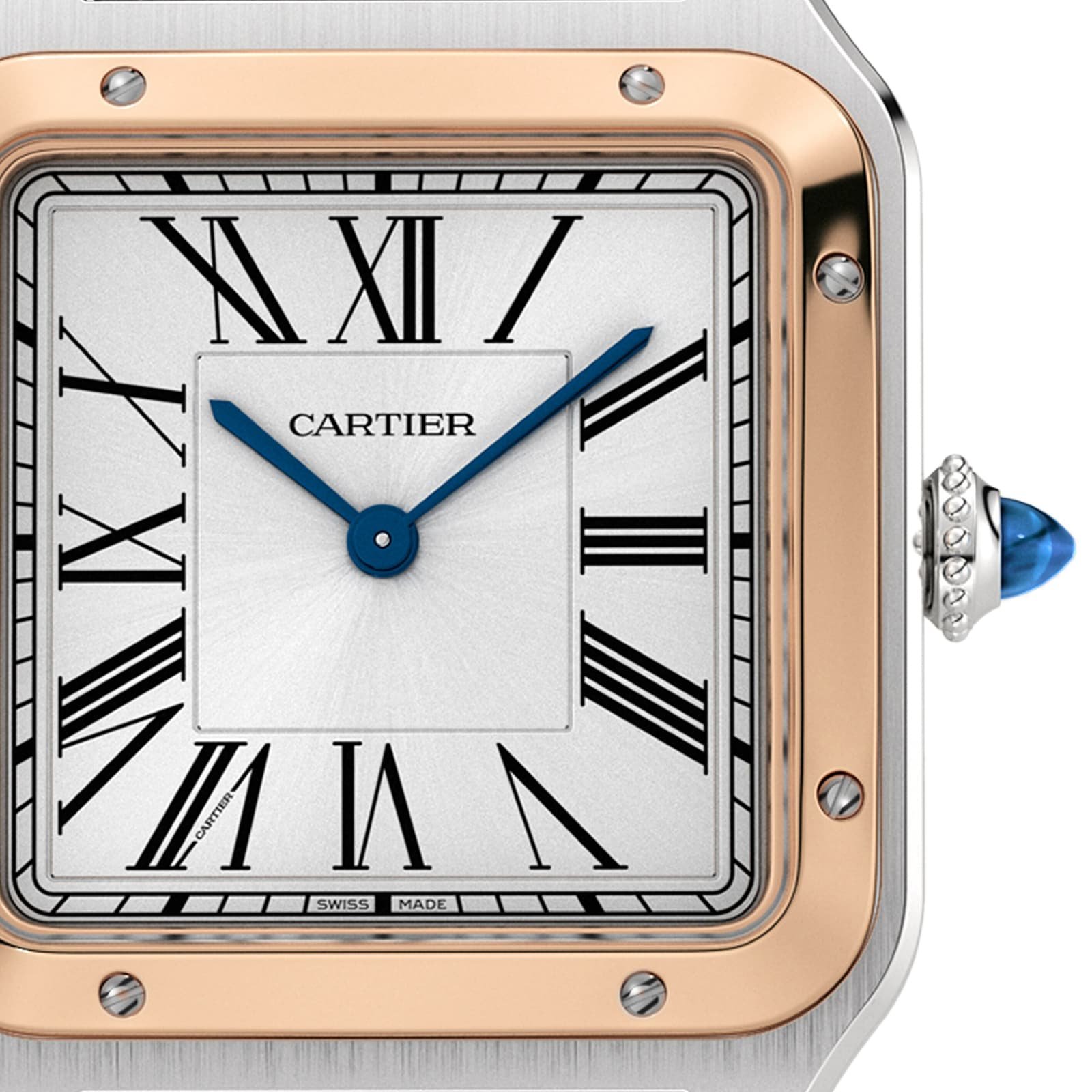 Santos-Dumont watch, large model, high autonomy quartz movement (~ 6 years). Steel case, 18K pink gold bezel, steel beaded crown set with a blue synthetic cabochon-shaped spinel, satin-brushed silver dial with sunray effect, Roman numerals, blued-steel sword- shaped hands, sapphire crystal. Strap in black alligator leather, with steel ardillon buckle. Case dimensions: 43.5 mm x 31.4 mm, thickness: 7.3 mm. Water-resistant up to 3 bar (approx. 30 meters/100 feet). 1904, Louis Cartier granted the wish of his friend, the famous Brazilian aviator Alberto Santos Dumont: to be able to tell time while flying. Thus, one of the first wristwatches was born. Featuring geometric shapes and exposed screws, the watch quickly became an icon within the House. The Santos collection rises to the ranks of a classic that would defy the hands of time. Explore the full Cartier range here.