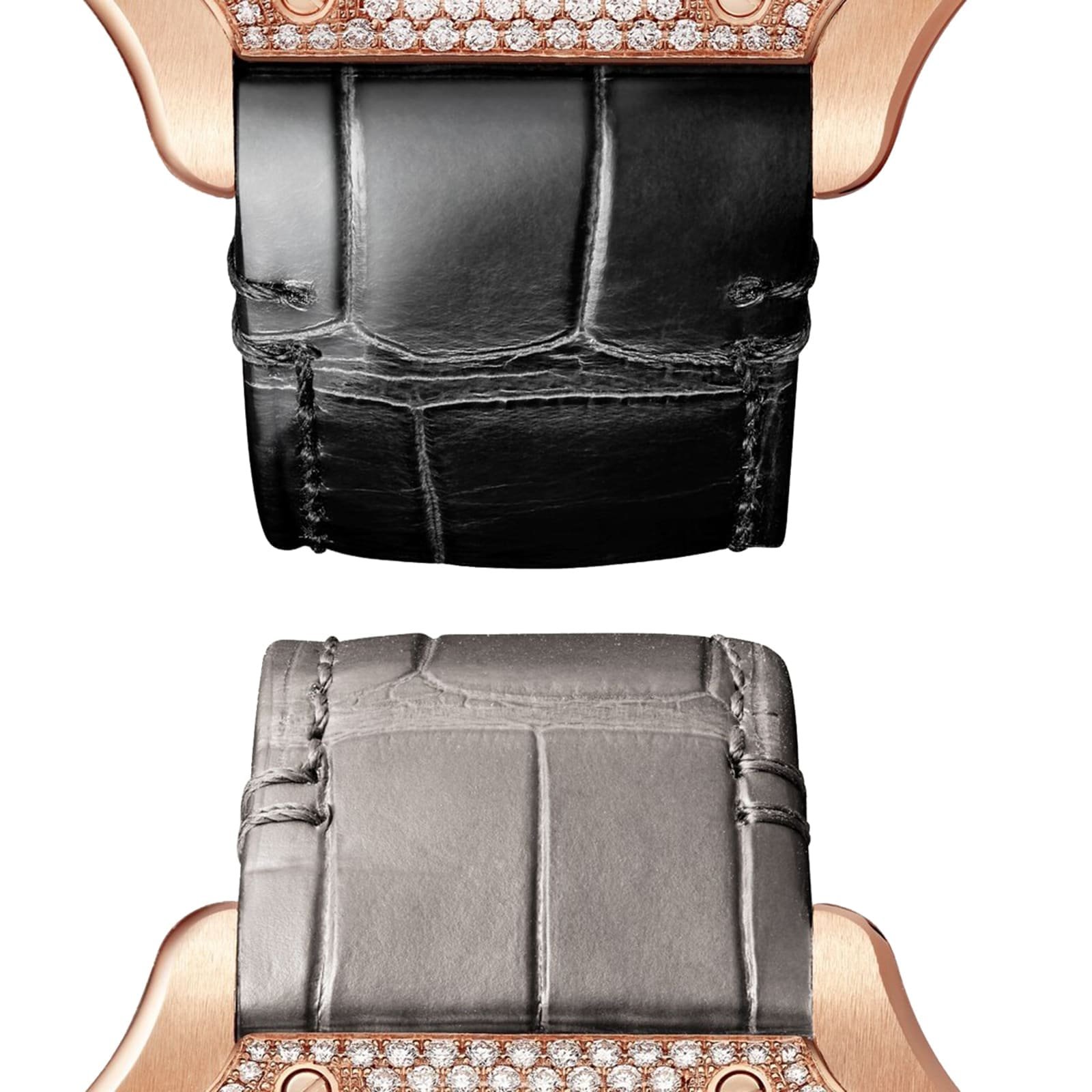 1904, Louis Cartier granted the wish of the famous Brazilian aviator Alberto Santos Dumont: to be able to tell time while flying. The birth of one of the first ever wristwatches sealed the bonds of friendship between these two pioneers. The rounded angles of the dial, the seamless curve of the horns, and the exposed screws made for an iconic watch that would inspire countless reinterpretations. Santos watch, medium model, Manufacture mechanical movement with automatic winding, caliber 1847 MC. 18K rose gold (750/1000) case, bezel set with brilliant-cut diamonds. 18K rose gold (750/1000) 7-sided crown set with a faceted sapphire, sunray-effect dial, blued-steel sword-shaped hands, sapphire crystal. Two alligator-skin straps with the ‘QuickSwitch’ interchangeability system, interchangeable folding buckle in 18K rose gold (750/1000). Case width: 35.1 mm, thickness: 8.83 mm. Water-resistant up to 10 bar (approx. 100 meters/100 feet).