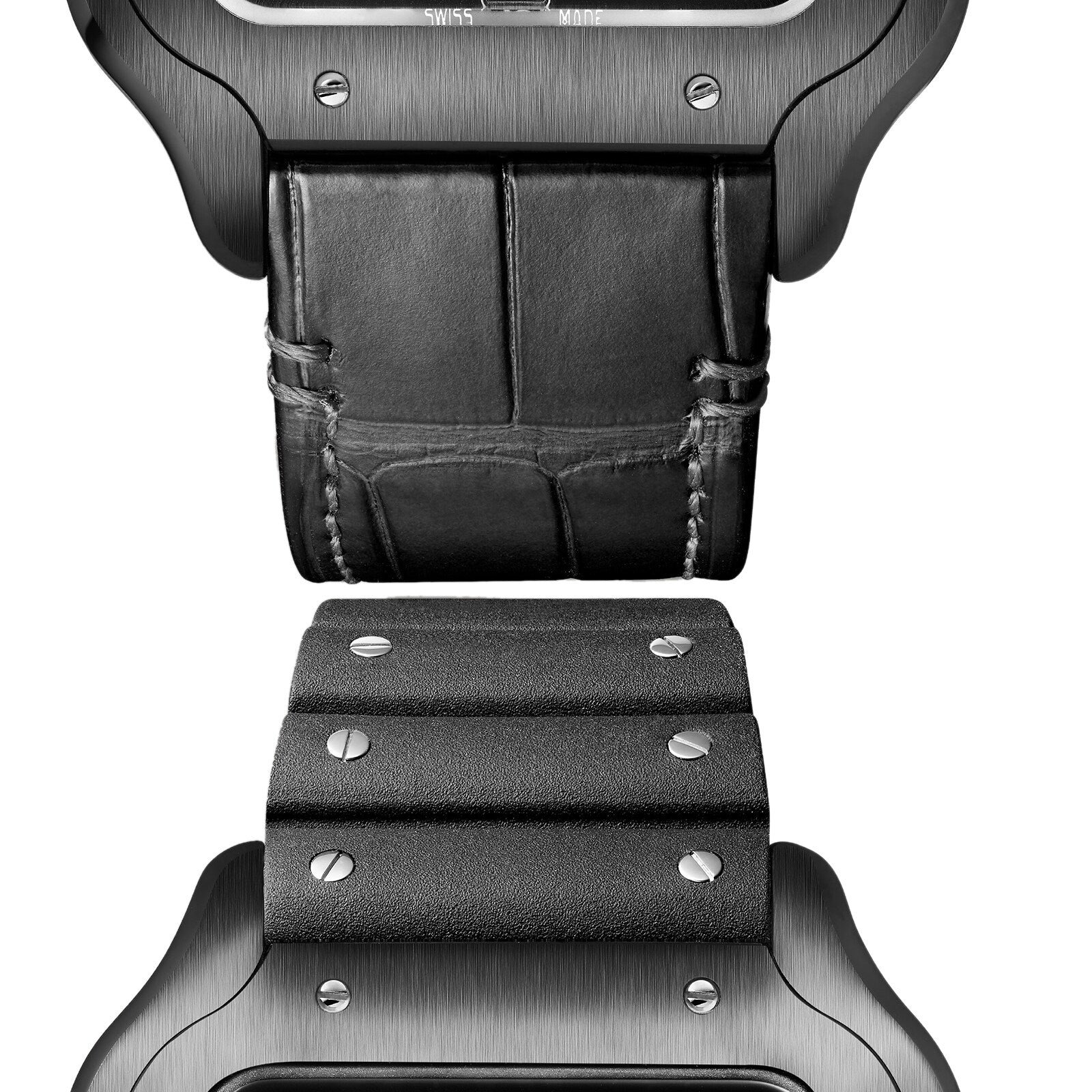 Santos de Cartier watch, large model, Manufacture mechanical movement with automatic winding, caliber 1847 MC. Bezel and case in steel and ADLC, steel crown set with a black faceted synthetic spinel, black dial, black steel sword-shaped hands with luminescent material, sapphire crystal. A rubber strap, second strap in black alligator leather, steel interchangeable deployant buckle. Both bracelets are equipped with the “QuickSwitch” interchangeability system. Case width: 39.8 mm, thickness: 9.38 mm. Water-resistant up to 10 bar (approx. 100 meters/100 feet). 1904, Louis Cartier granted the wish of the famous Brazilian aviator Alberto Santos Dumont: to be able to tell time while flying. The birth of one of the first ever wristwatches sealed the bonds of friendship between these two pioneers. The rounded angles of the dial, the seamless curve of the horns, and the exposed screws made for an iconic watch that would inspire countless reinterpretations. Explore the full Cartier range here.