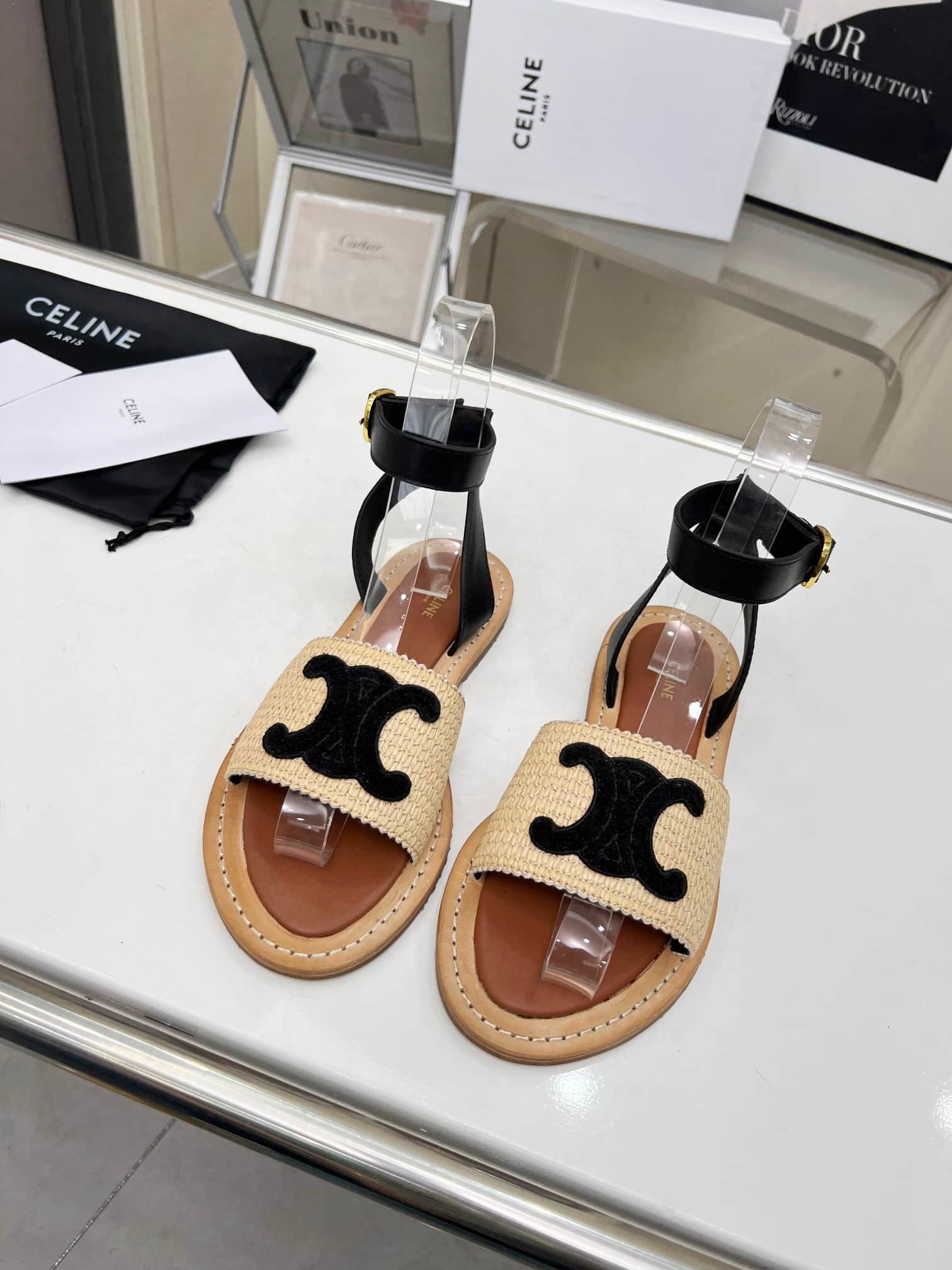 Celine Lympia Flat Strap Sandal In Raffia Calfskin Beige Black 352402248C 02Bl