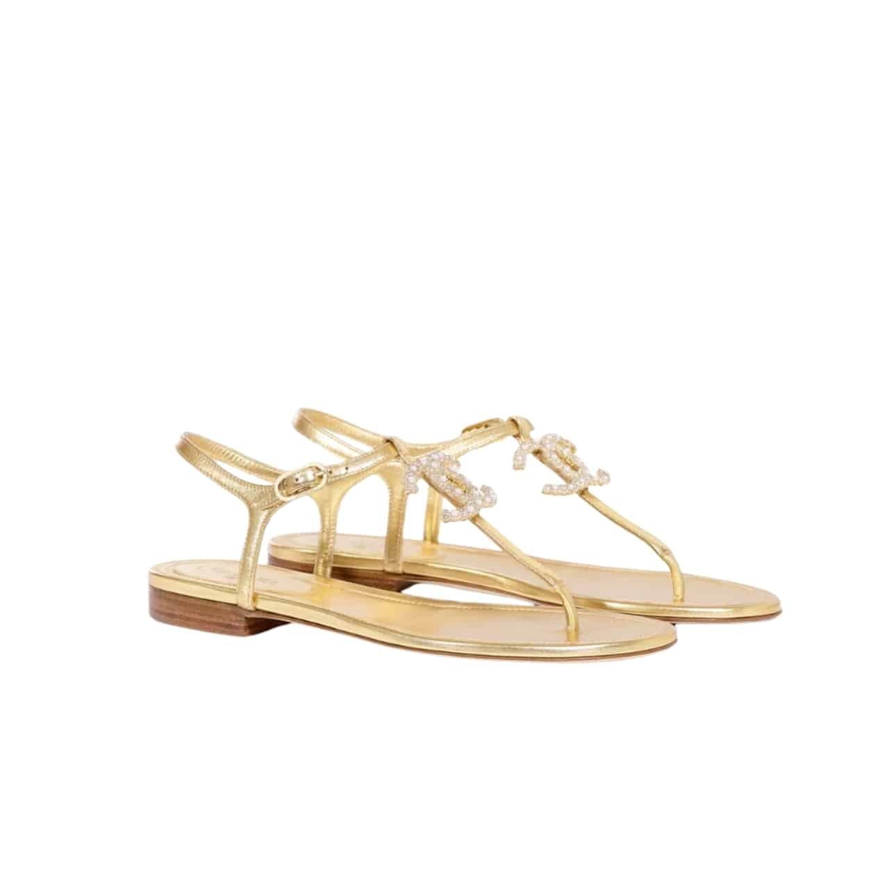 Chanel Gold Pearl Cc Logo Thong Sandals Golden