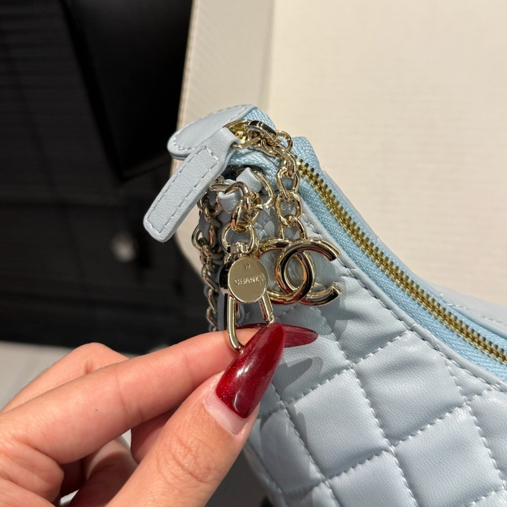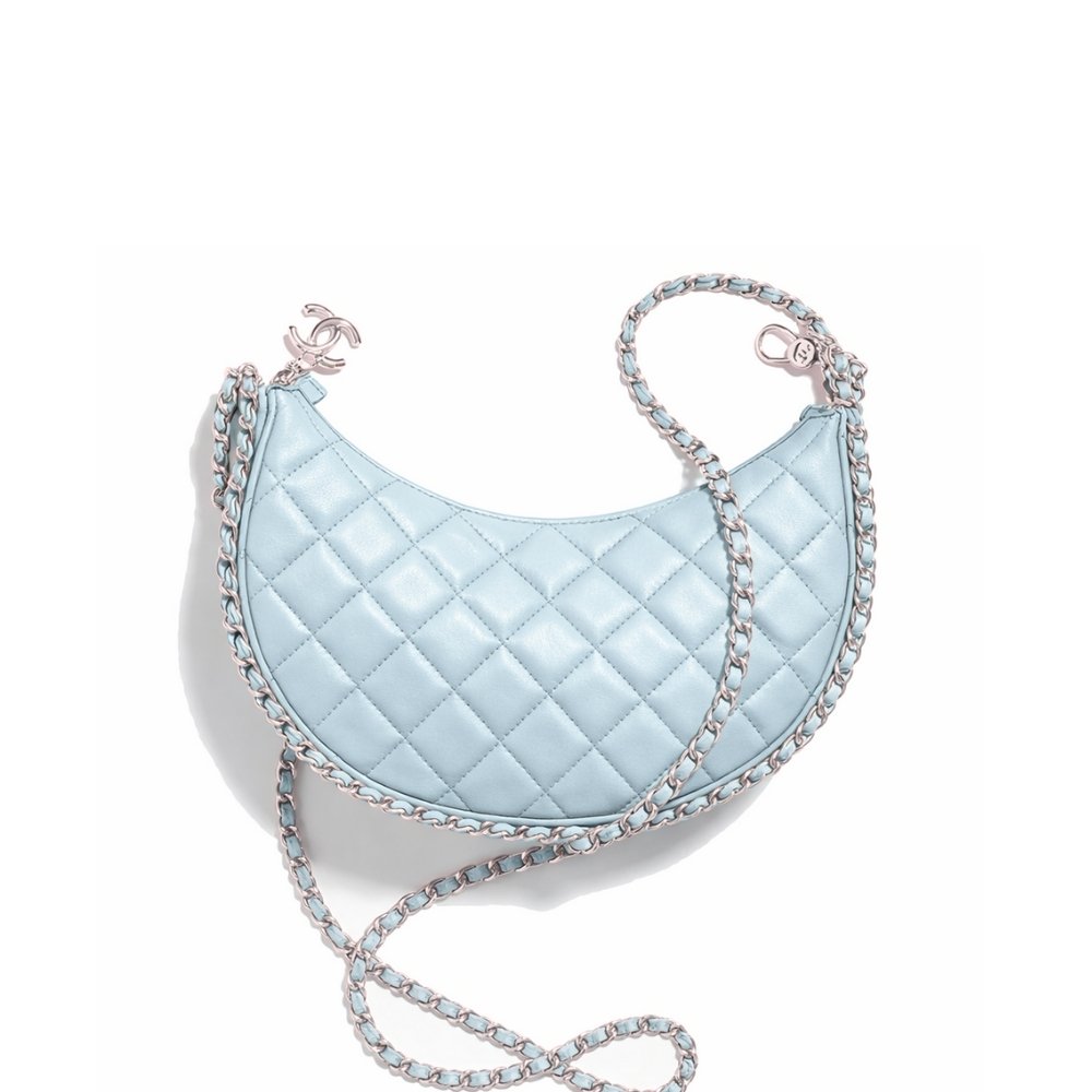 The Chanel Hobo Bag in light blue, featuring a shiny leather finish and silver-tone metal accents. The bag has a quilted design and a chain strap for easy carrying. It is compact in size, measuring 20cm, and offers a chic, modern look.