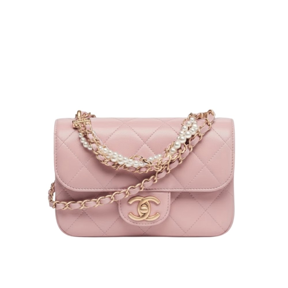 Chanel Mini Flap Bag in Shiny Leather and Pearls Light Pink 20Cm