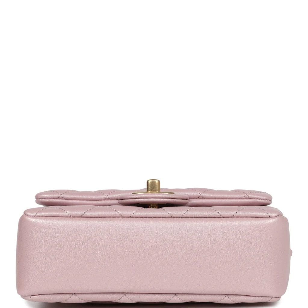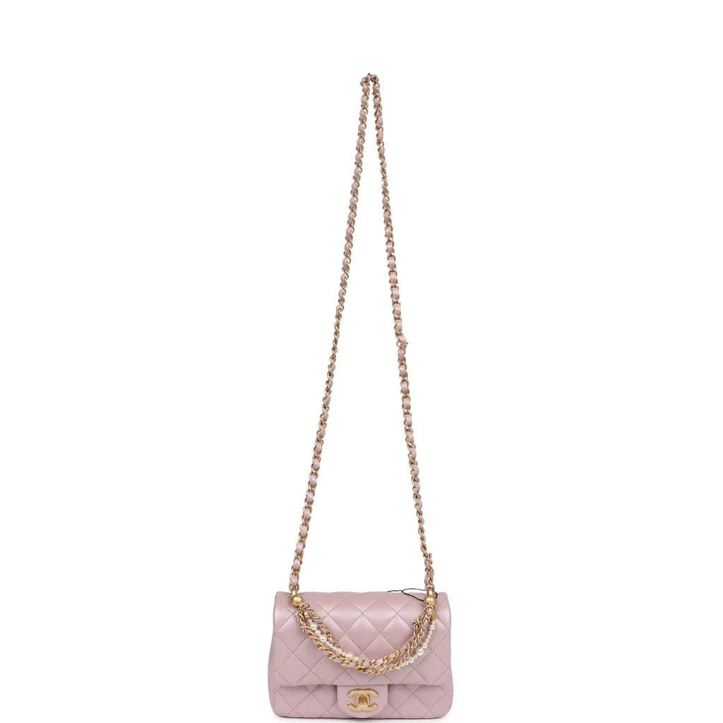 Chanel Mini Square Pearl Flap Bag Light Pink Iridescent Lambskin Brushed Gold Hardware