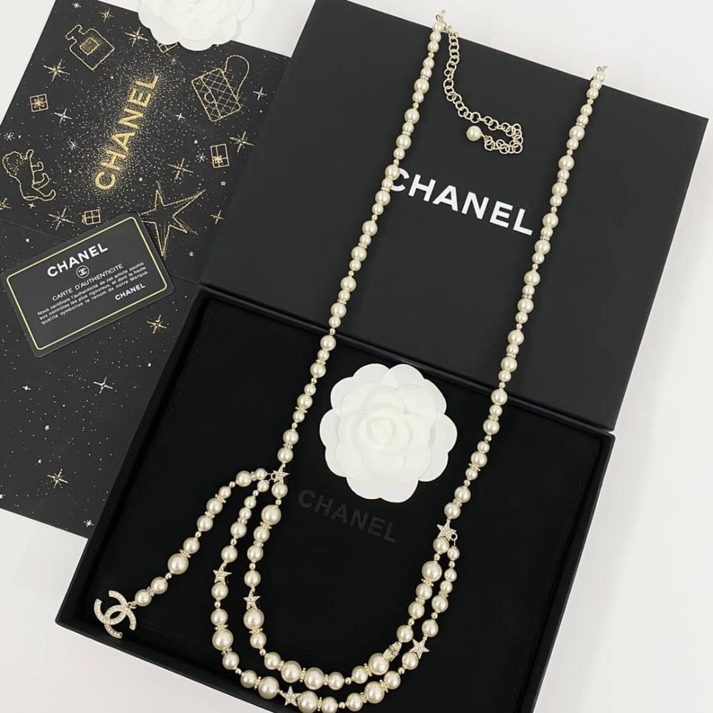 Exuding timeless elegance with a modern twist, the Chanel Pearl Necklace is a perfect blend of sophistication and signature style. The necklace features three strands of lustrous pearls, accented with gold-tone metal details and delicate star charms. The iconic Chanel double “C” logo gracefully hangs from the second strand, adding a touch of luxury and distinction. A must-have for those who appreciate classic refinement and the enduring quality of Chanel, this piece elevates any look with its chic and timeless appeal.