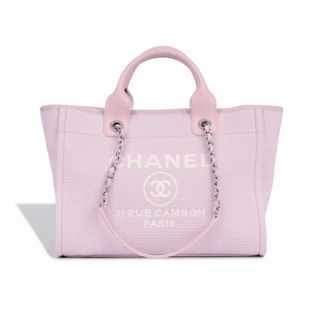This Chanel Deauville tote bag features a canvas body, top handles, a detachable and adjustable chain strap, a push lock closure, and silver-tone hardware. It includes a pouch. This bag can be hand carried or worn on the shoulder.