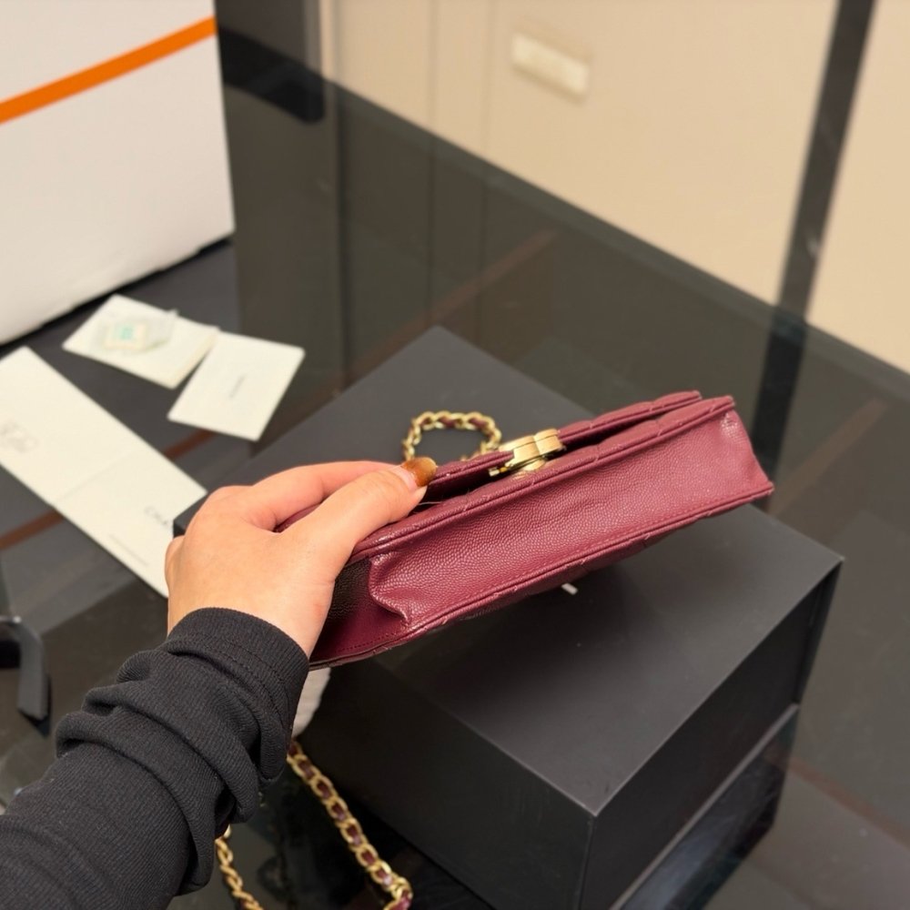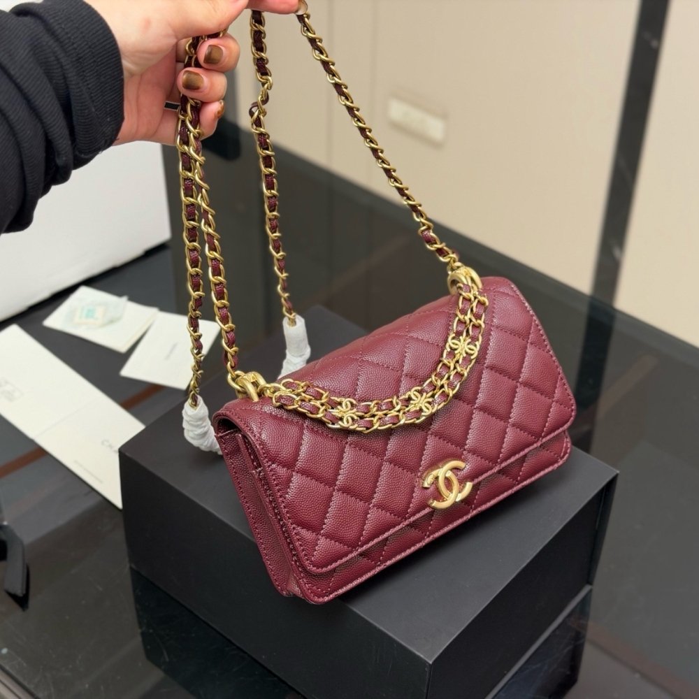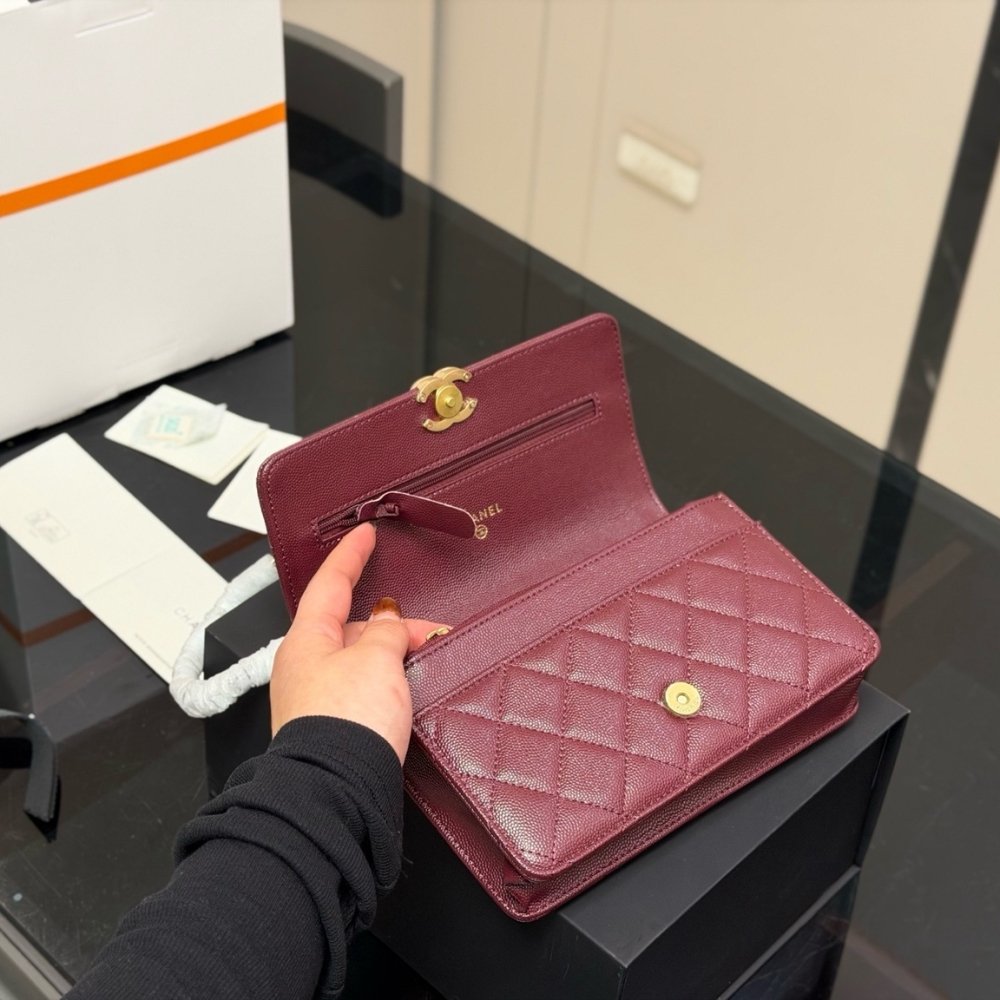 The Chanel Wallet On Chain (WOC) in Dark Burgundy is a quintessential luxury accessory that seamlessly bridges the gap between a high-end wallet and a classic evening bag. This specific model is distinguished by its deep, elegant burgundy hue, typically rendered in shiny grained leather, and is beautifully accented by polished gold-tone metal hardware.