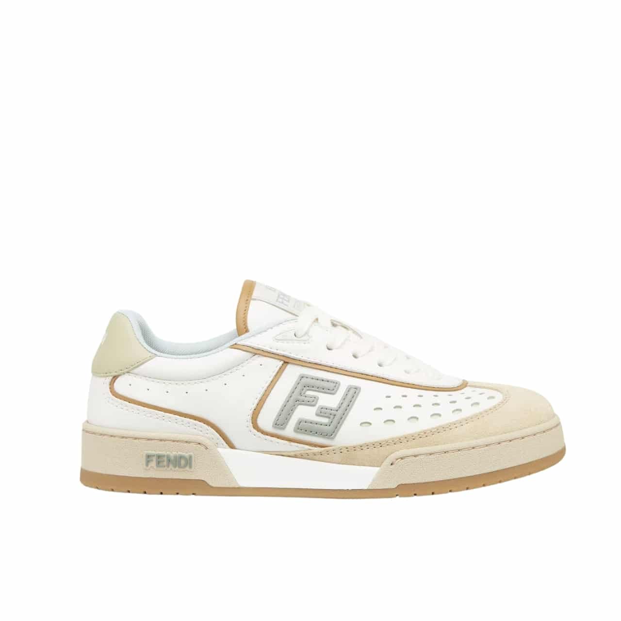 - Made of white leather with beige suede details.
