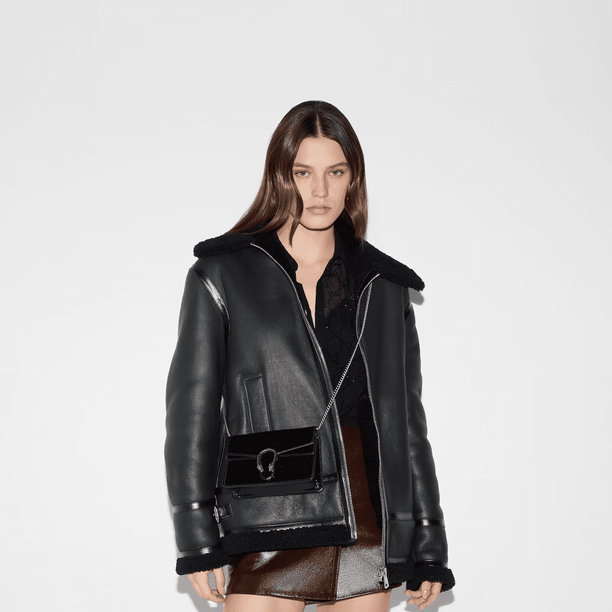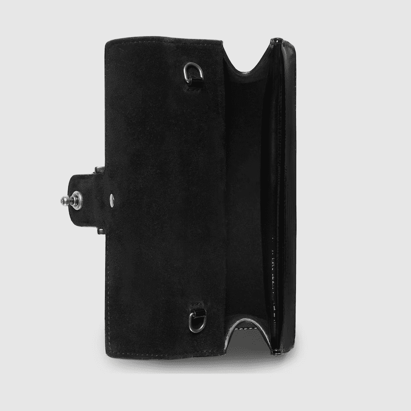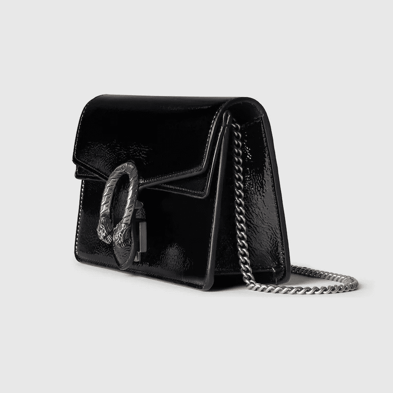 A shiny patent leather brings a fresh take to the Dionysus’ well-structured design, while creating contrast with the signature tiger head hardware in a silver tone. A suede leather lining completes the style with an elegant finish.