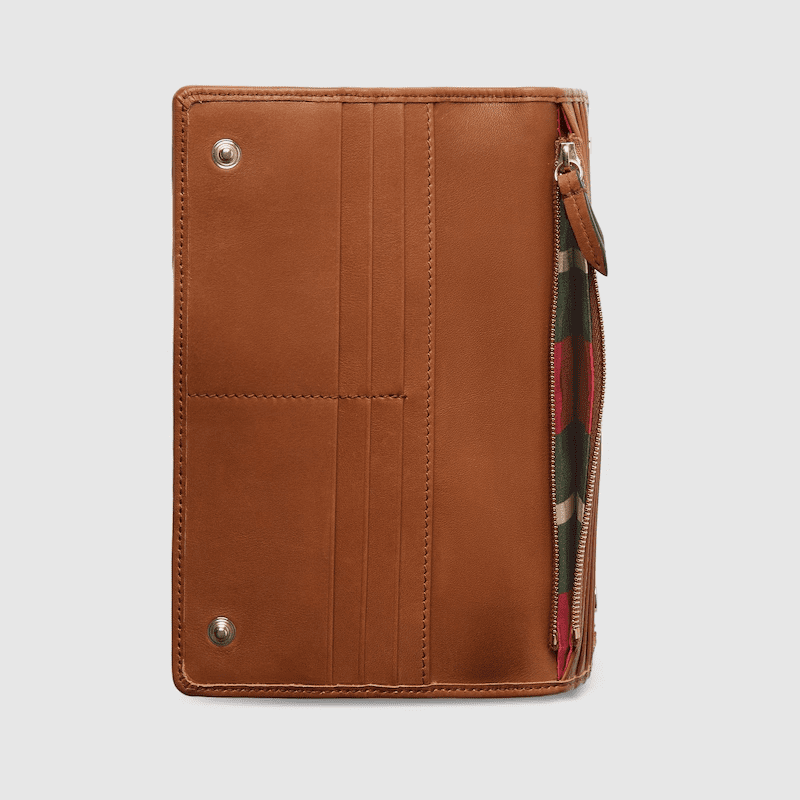 The GG Emblem collection reinterprets iconic motifs through creativity and innovative functions, and is envisioned to be cherished for years to come. Introduced in the latest line of small accessories, this beige and dark brown continental wallet is crafted from the new GG Monogram canvas. The design features an embossed Gucci on the front and a D-ring for attachments.