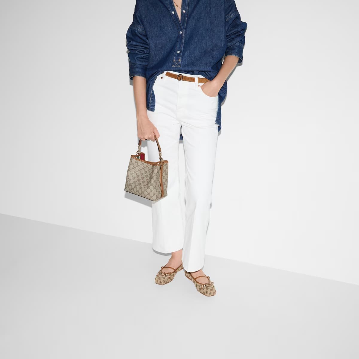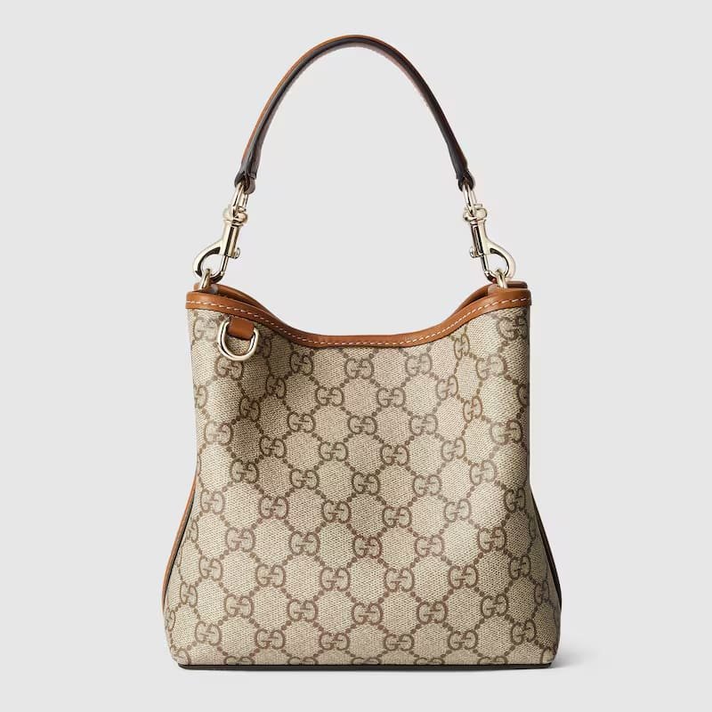 The new GG Emblem collection reinterprets the House’s history of elegance and craftsmanship. This mini bucket bag highlights functional design with an interior compartment, in Web cotton lining.