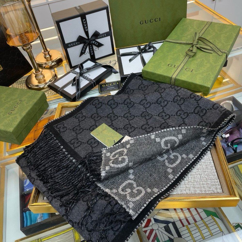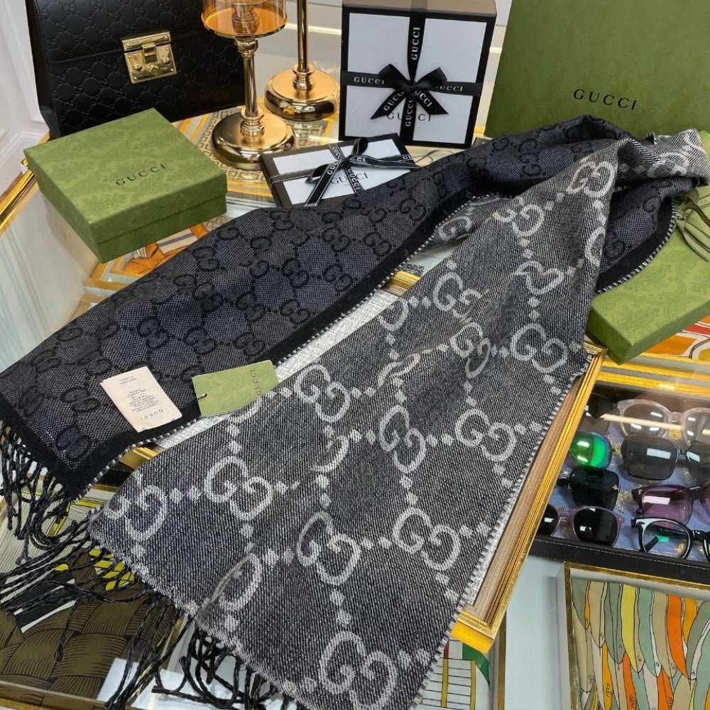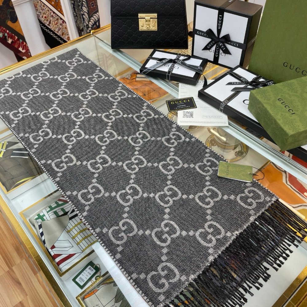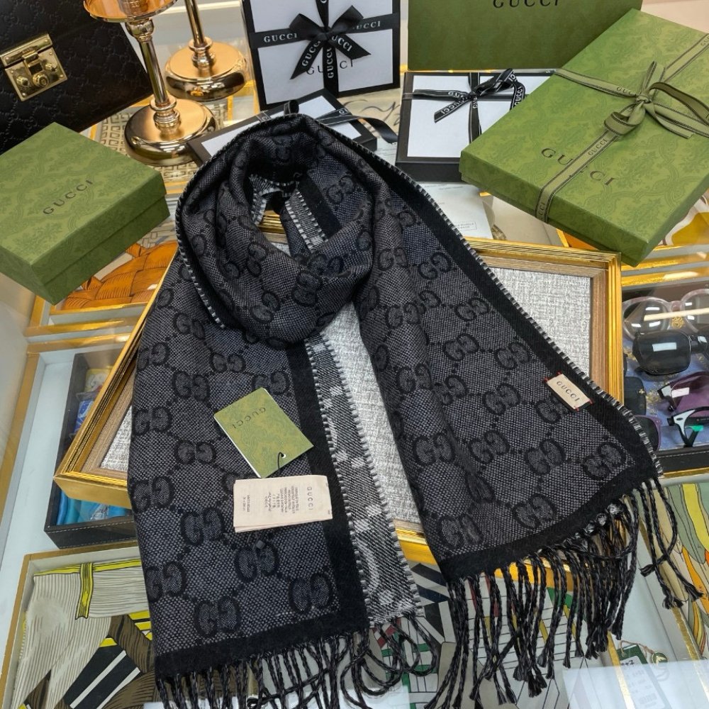 Gucci Gg Jacquard Knit Scarf Tassels Gray And Black 180Cm