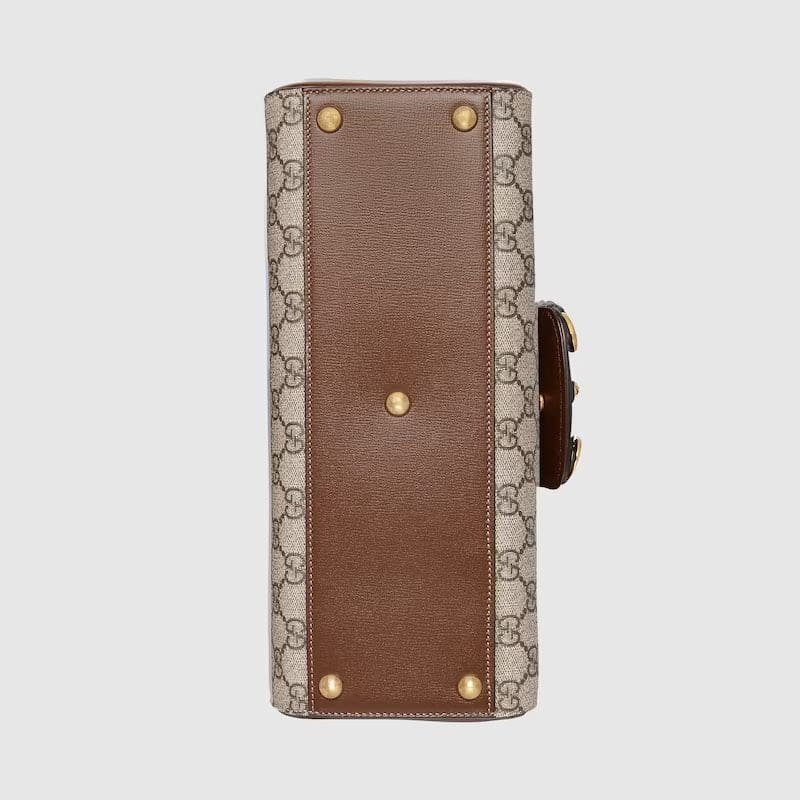 The Gucci Horsebit 1955 is introduced in beige and ebony GG Supreme canvas and a medium size. The collection unifies details first introduced on the original bag that inspired the line from over six decades ago with a modern spirit, highlighting the Horsebit. Part of Gucci’s genetic code, the double ring and bar design has been established as one of the most distinctive elements among the House symbols borrowed from the equestrian world. A brown leather trim completes the style with an elevated feel.