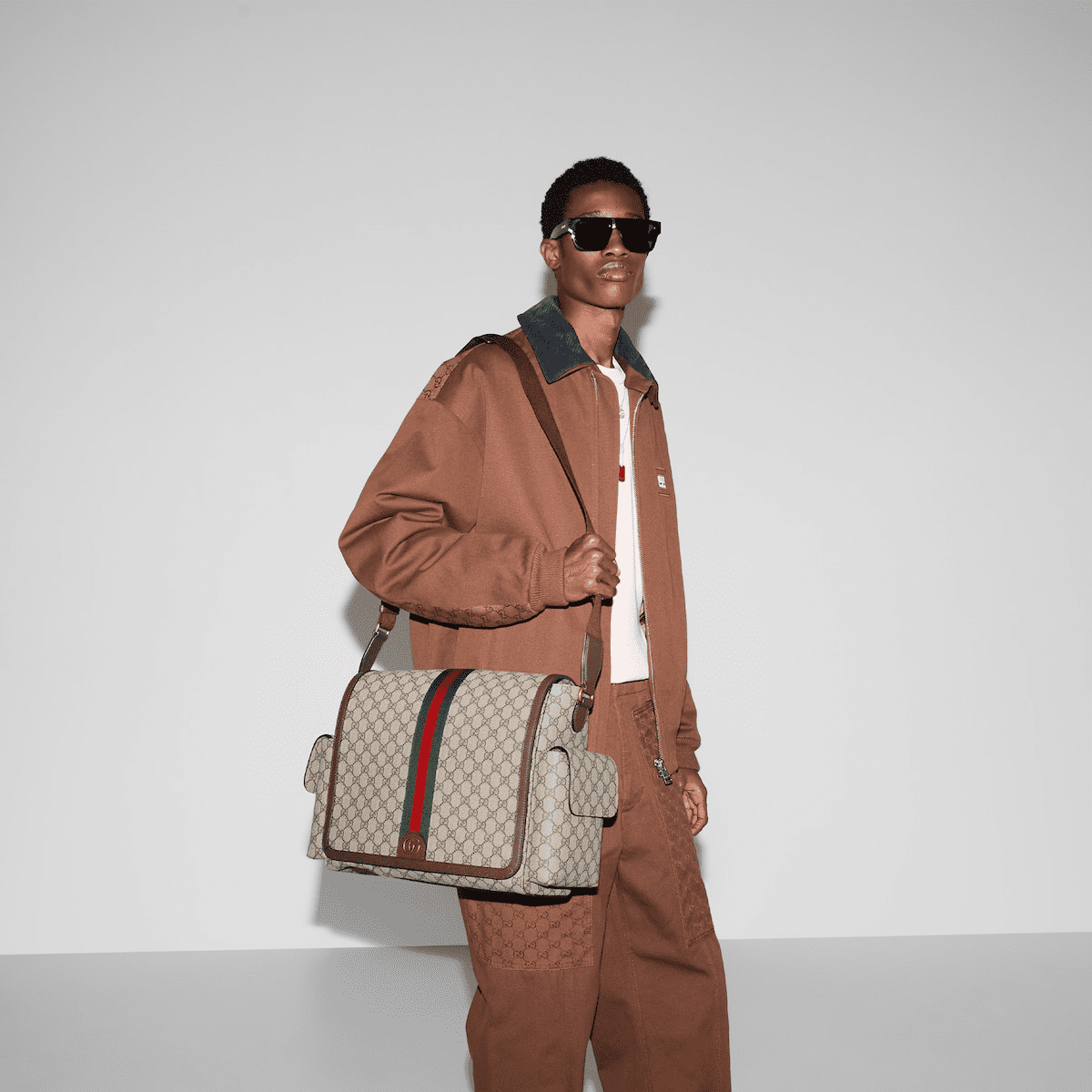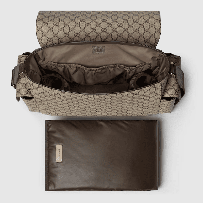 Crafted from beige and dark brown GG Supreme canvas, the emblematic design combines with House Web to give this diaper bag a strong logo touch with archival references. The accessory features inside pockets and outside compartments, as well as a removable changing mat.