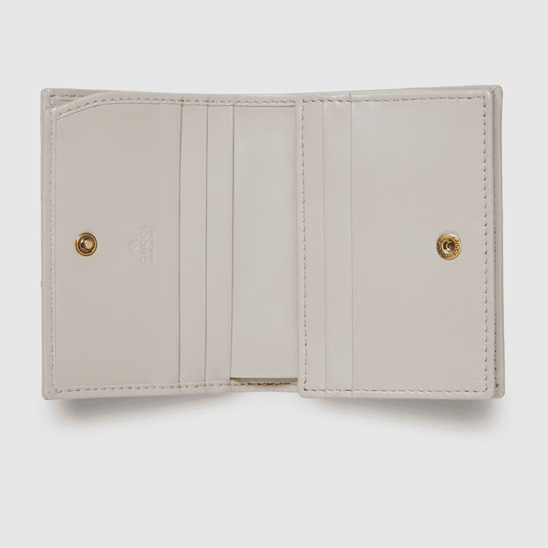 The GG Marmont collection is defined by the emblematic Double G hardware—a contemporary take on a Gucci archival belt buckle from the ’70s that has become a hallmark of the House. This card case wallet is crafted with the same matelassé leather as the bags from the rest of the collection.