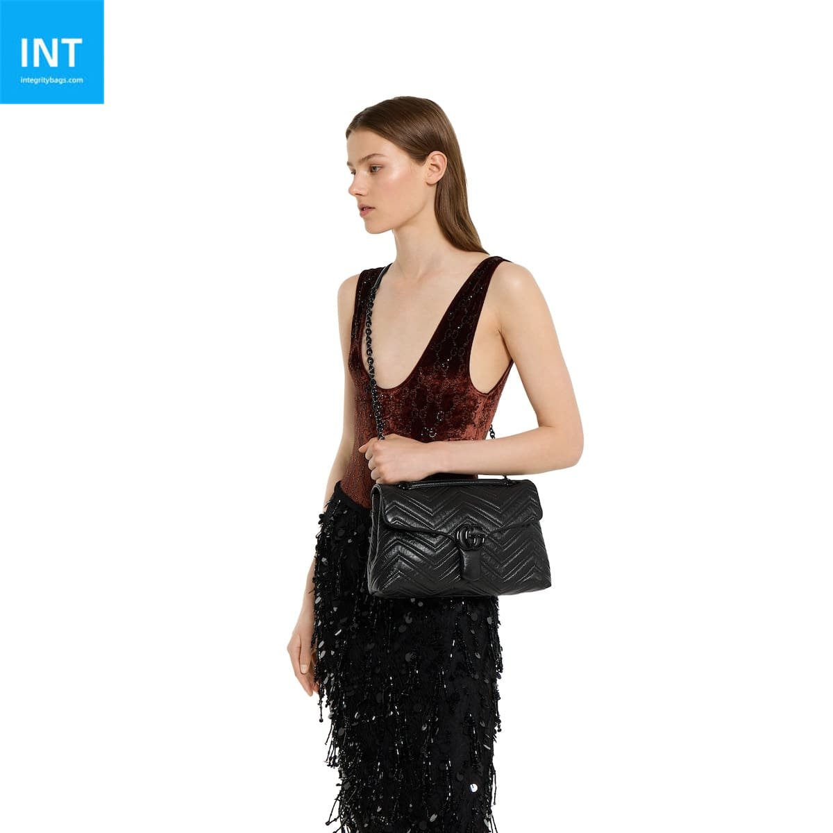 In the Fall Winter 2025 collection, the GG Marmont, a signature collection of the House, features the emblematic Double G, a faceted chain strap, and a soft, structured silhouette. This style is crafted from soft lightweight matelassé chevron leather and comes with a tonal enameled hardware and chain.