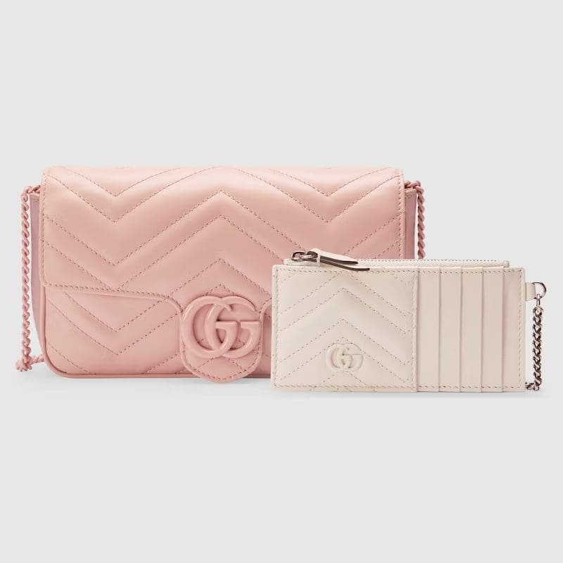 Gucci’s signature small accessories are constantly evolving around a dynamic narrative. A delicate shade of pink defines this GG Marmont mini bag, completed by matching tonal hardware. The inside features a contrasting white leather card case that can be detached.