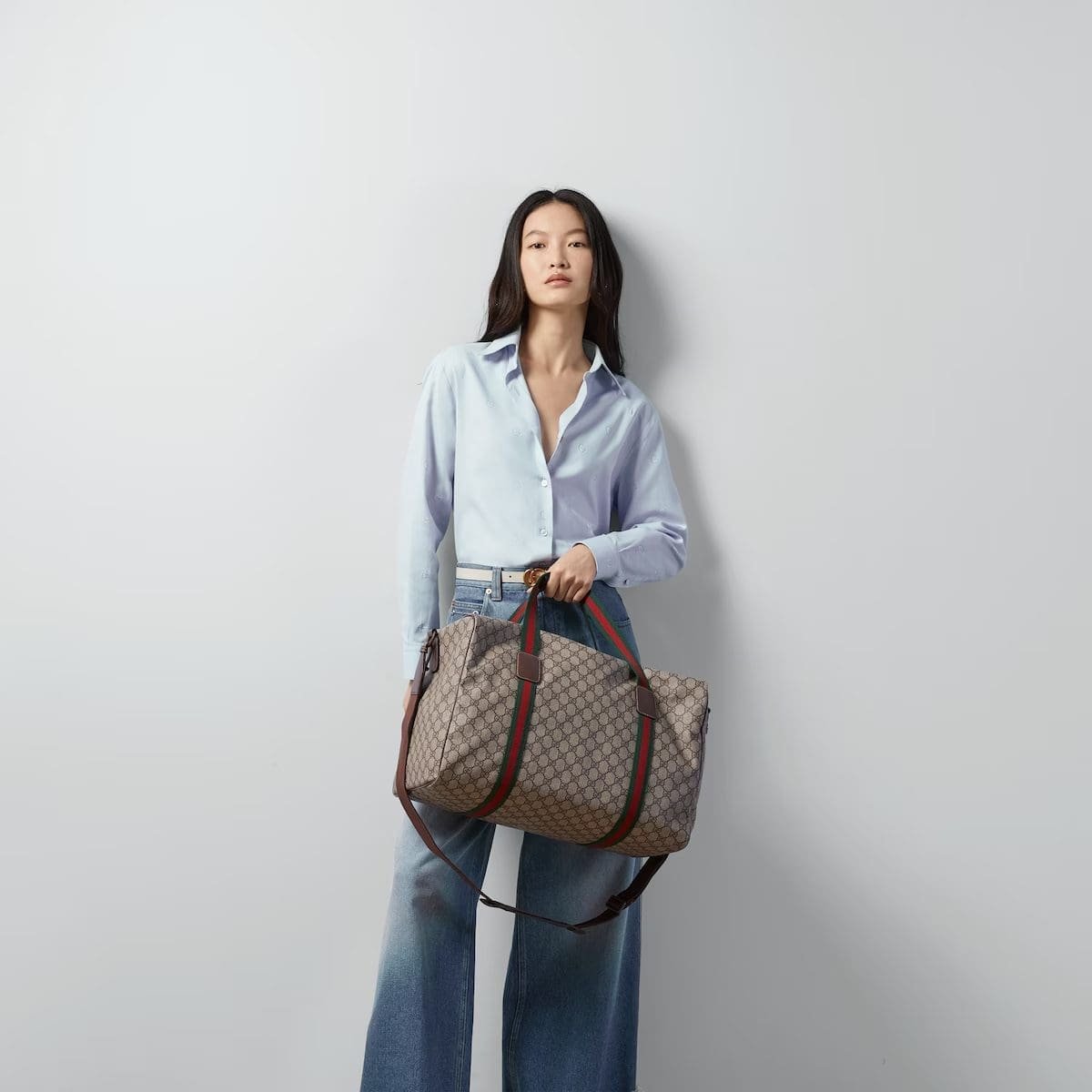 The GG Supreme is inspired by an archival design from the 1930s and remains one of the House’s most emblematic materials. Here, the classic palette defines this duffle bag. A green d and red Web completes the travel piece.