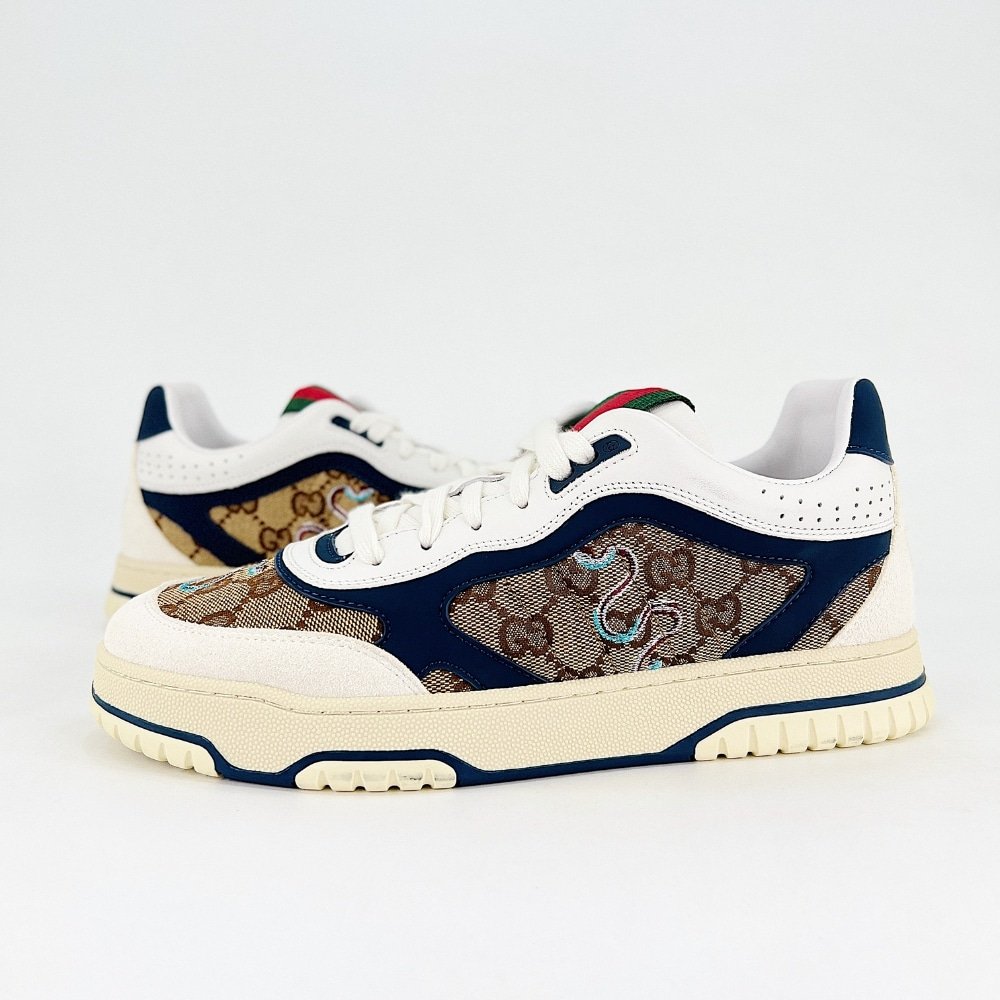 The Re-Web sees Gucci’s heritage stripes as a bold statement detail on a contemporary silhouette. Defined by signature details, this pair of trainers is crafted from beige and blue Original GG canvas and completed with green and red Web tongue.