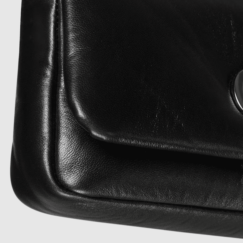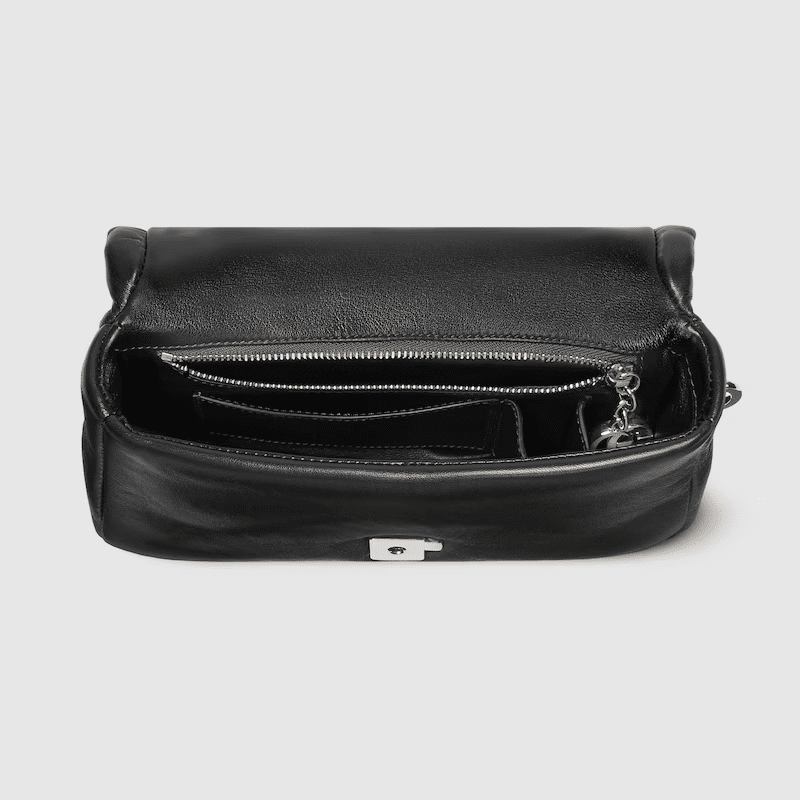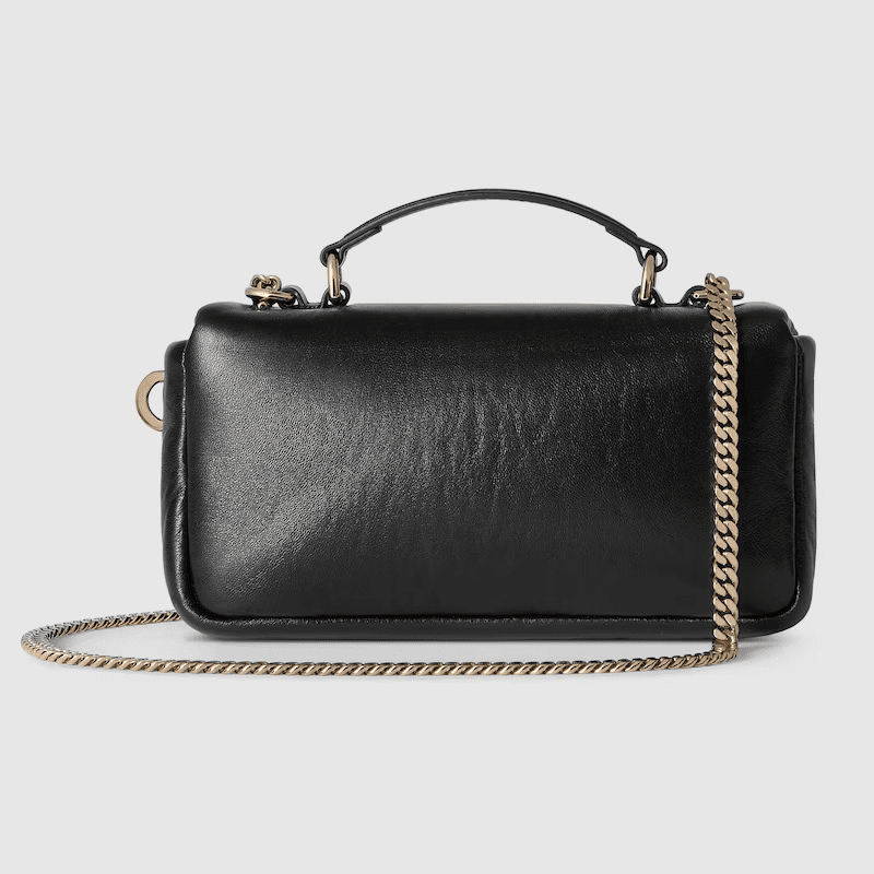 The GG Milano top handle bag by Creative Director Sabato De Sarno debuted at the Fall Winter 2024 fashion show during Milan Fashion Week, paying tribute to the city which inspired the design. It features a new Double G hardware, and the puffy leather has a soft and silky touch. The chain strap allows the bag to be worn crossybody or on the shoulder.