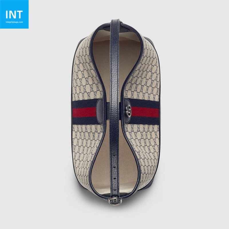 The Ophidia is reinvented in new and unexpected ways in this medium-sized piece, which blends the open bucket design and shoulder bag style. It is crafted in the House’s signature GG Supreme canvas in the color combination of beige and blue.