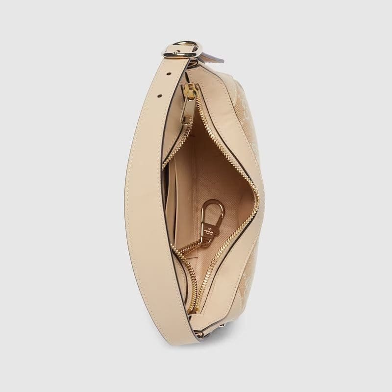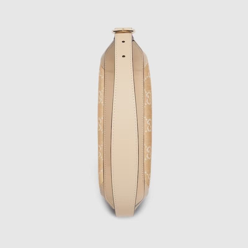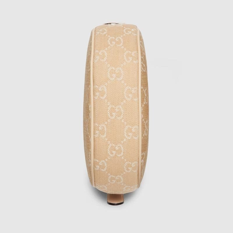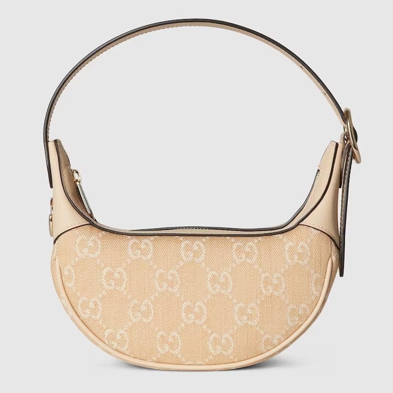 The GG pattern, a recognisable design of the House, continues to define handbags and small leather goods. Here, the Ophidia mini bag is presented in light beige GG denim, enriched with tonal leather trims. A light gold-toned hardware completes the accessory with a metallic contrast.
