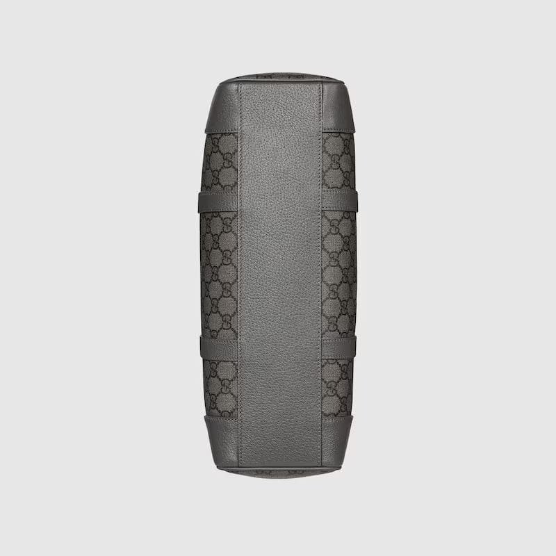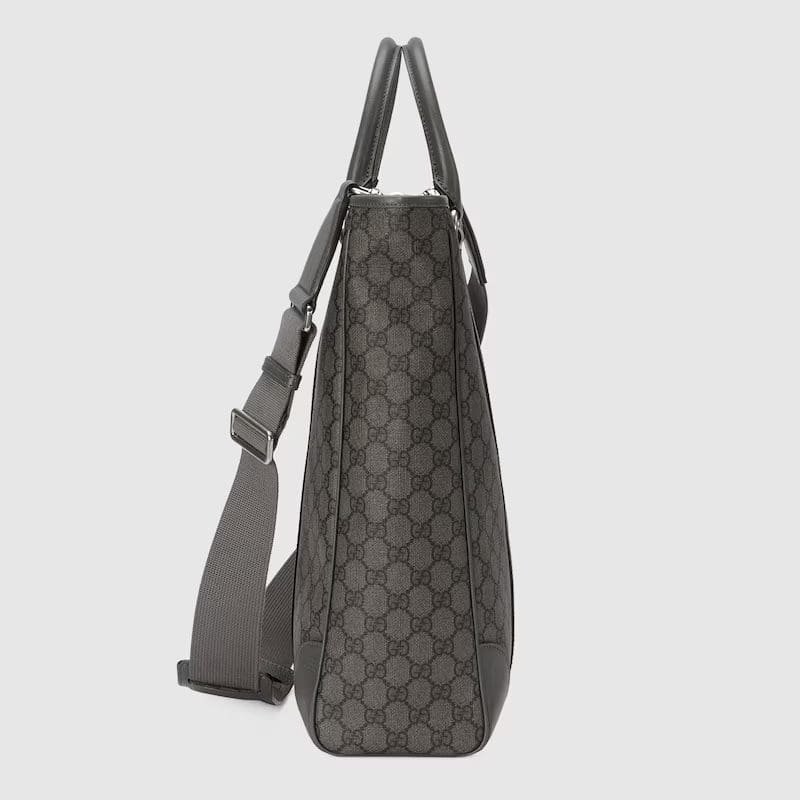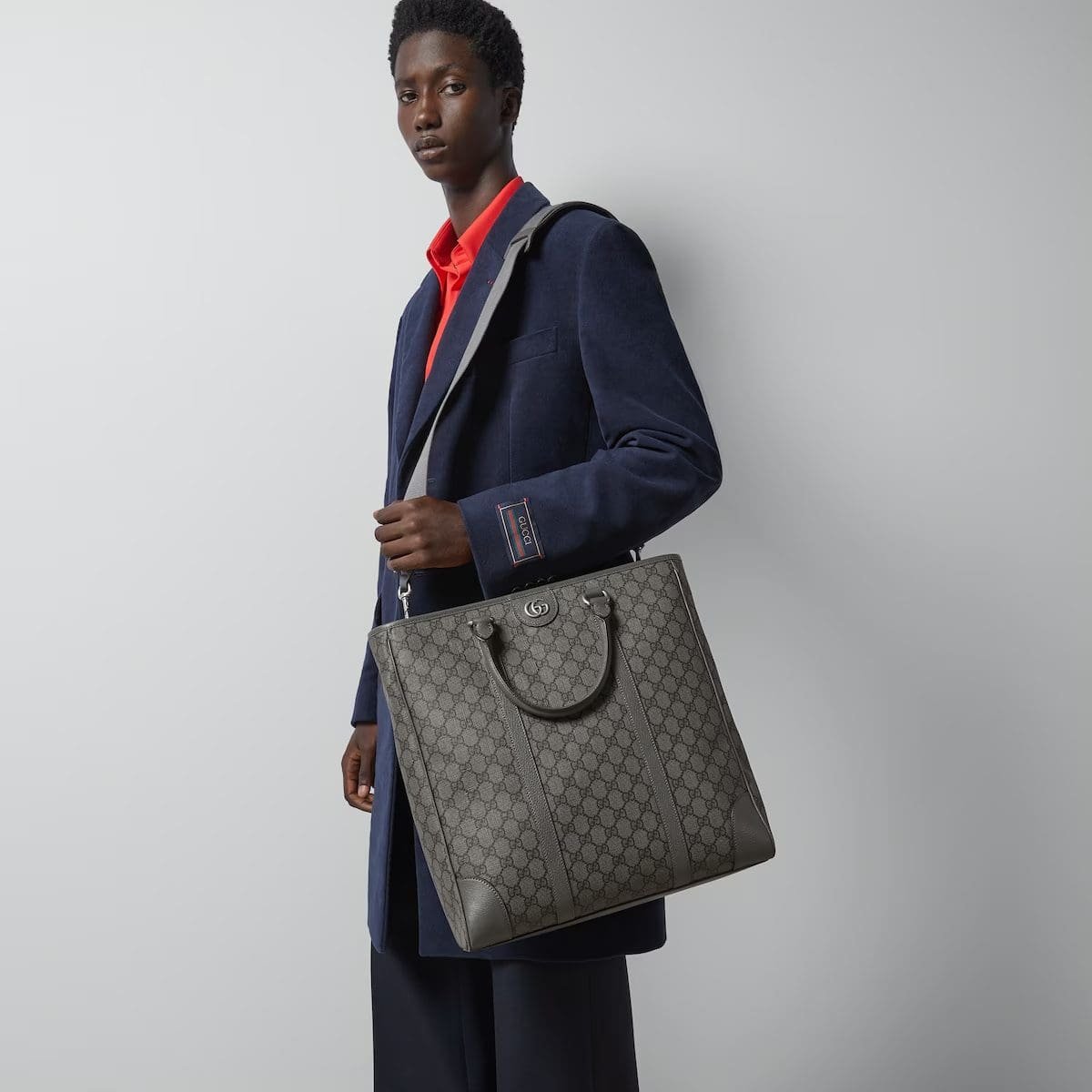 The GG Supreme Tender canvas, with its soft material and durable characteristics, lends itself well to the men’s accessories line, adding a modern feel to established House designs. This Ophidia tote bag is presented in a grey and black variation of the GG Supreme Tender canvas, complete with the Double G hardware.