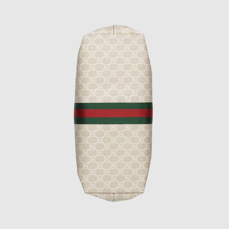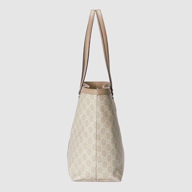 Inspired by the summer spirit and beach clubs on the Italian coast, this item is part of Gucci Lido. A heritage material from the archive, GG Supreme has been reimagined in Gucci Love Parade in different color combinations and combined with contemporary as well as classic styles. The Ophidia tote is presented in a beige and white variation of the signature material with a tonal trim. Originally a play on a ’30s design, the canvas speaks to the historical narrative that runs throughout the collection.