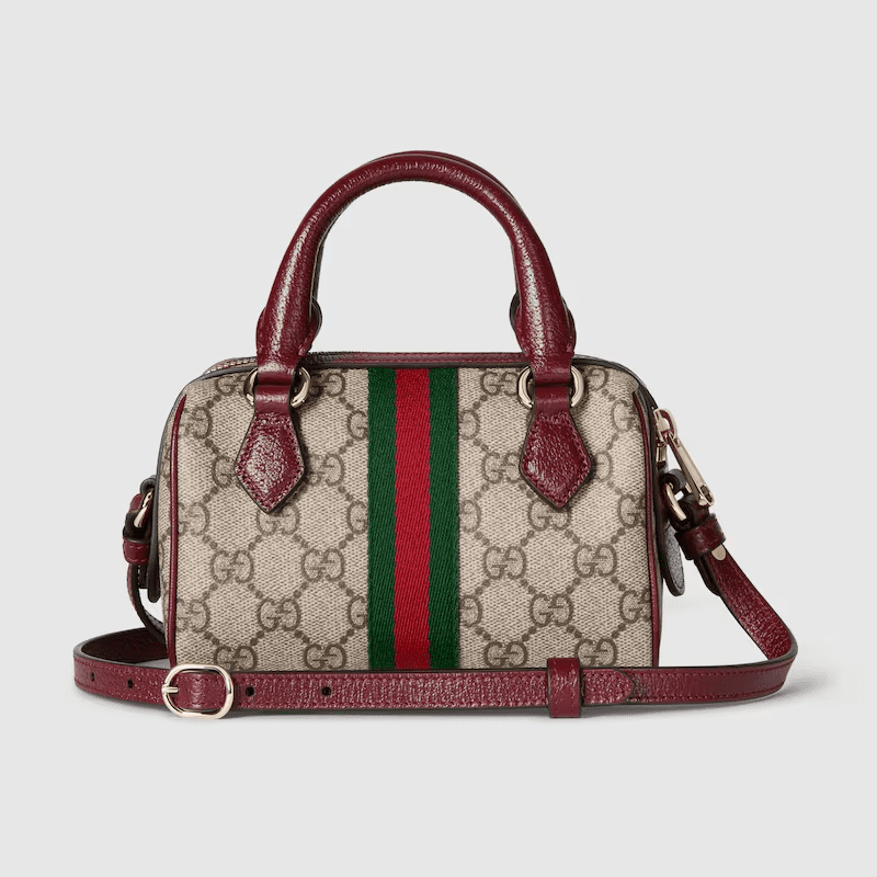 The Ophidia collection evokes the House’s heritage with the signature Web stripe and Double G emblem in light gold-toned finish. The styles are crafted from soft GG Monogram coated fabric, featuring green cotton lining inside. The boston bag design is presented in this mini style.