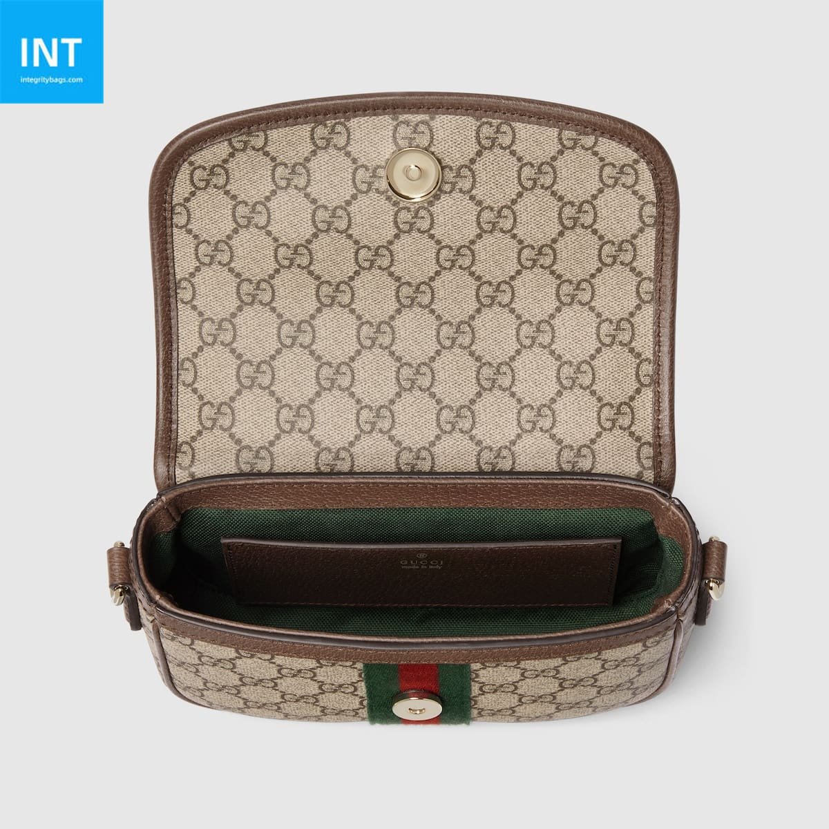 The Ophidia collection evokes the House’s heritage with the signature Web stripe and Double G emblem in light gold-toned finish. The styles are crafted from soft GG Monogram coated fabric, featuring green cotton lining inside.