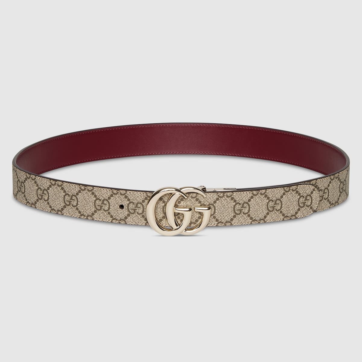 - Beige and dark brown GG Supreme on the one side, Gucci Rosso Ancora leather on the other