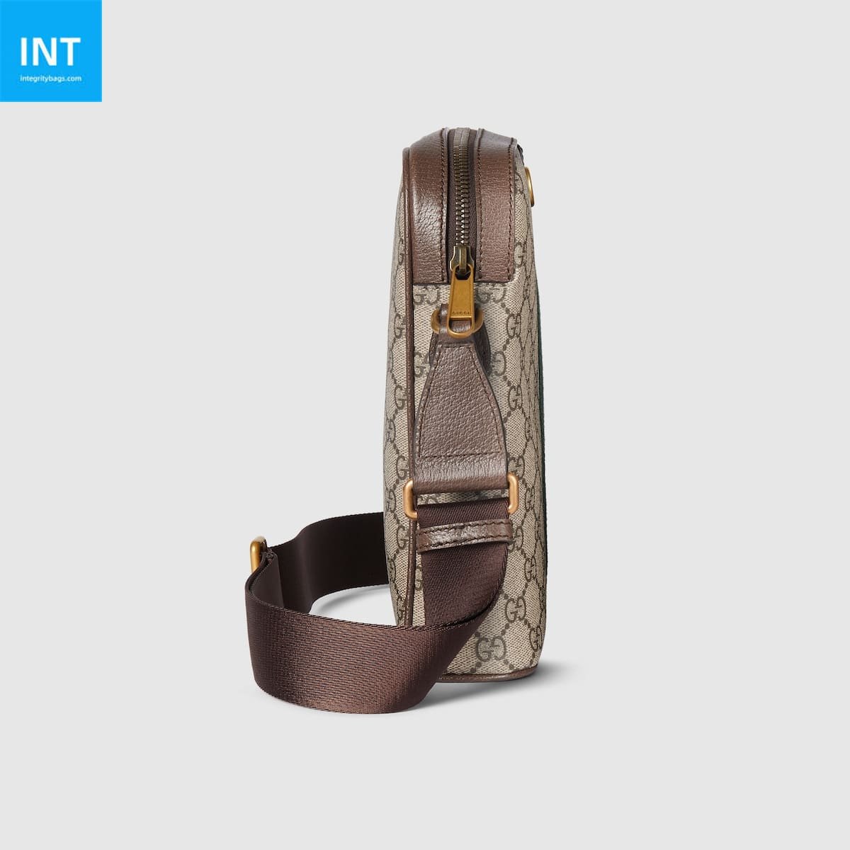The Ophidia line includes signature accessories and new silhouettes with a soft finish in classic beige and brown. This sling bag combines a coated GG monogram fabric design with a Double G and Web detail.