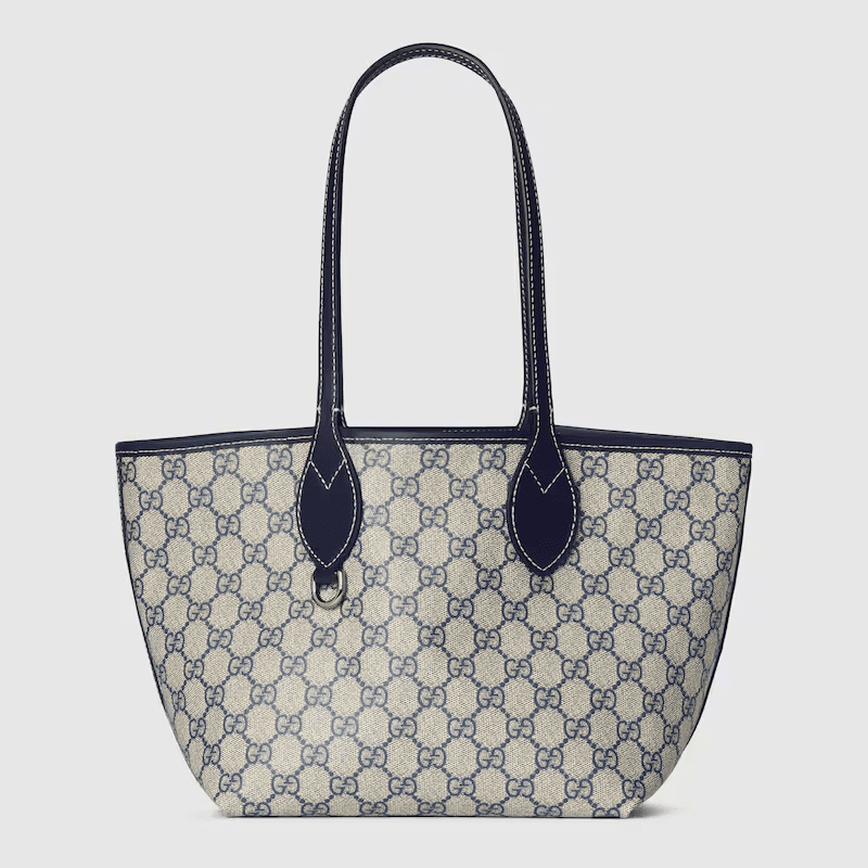 - Dark blue denim on one side, beige and blue GG Supreme on the other