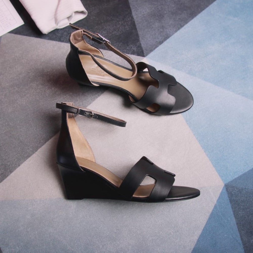 - Wedge heel, and thin ankle strap.