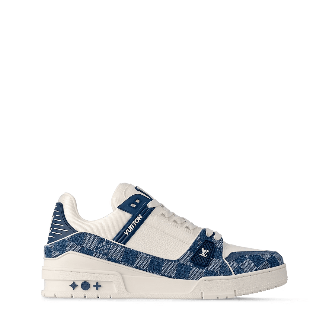 This edition of the LV Trainer sneaker pairs Damier denim with smooth calf leather. The combination of materials highlights this model’s elaborately constructed upper. Rubber signatures and a technical rubber outsole complete this cult design, which was originally created by Virgil Abloh.