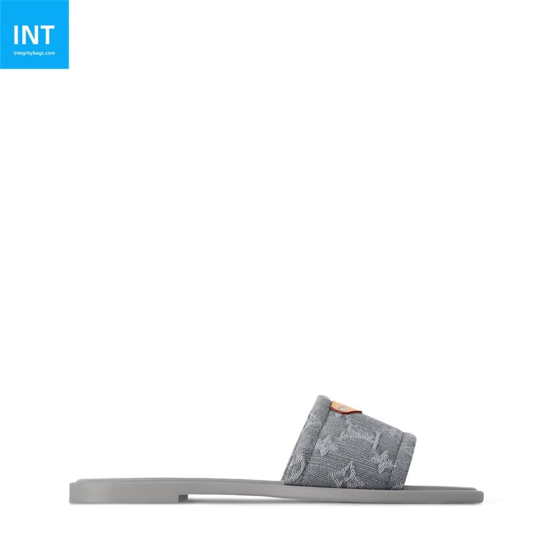The Lily flat mule is a casual-chic style in emblematic Monogram denim. It features a wide front strap, which is signed with a Louis Vuitton-embossed natural leather label and a gold-toned stud, referencing the leather goods collection. The supple leather outsole has a rubber insert for enhanced comfort.
