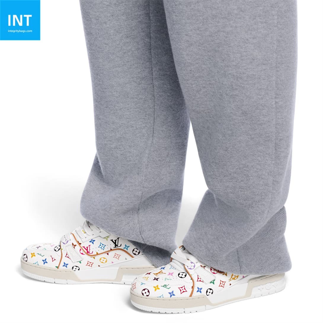 The iconic LV Trainer sneaker makes a fresh statement in grained calf leather featuring an allover print of a multicolored Monogram motif from the re-edition of the Louis Vuitton x Murakami collection, inspired by the artist’s exuberant aesthetic. Informed by vintage sporty styles, the upper is detailed with a cursive Louis Vuitton signature, while the back is printed with the number 54 in reference to 1854, the year the House was founded.