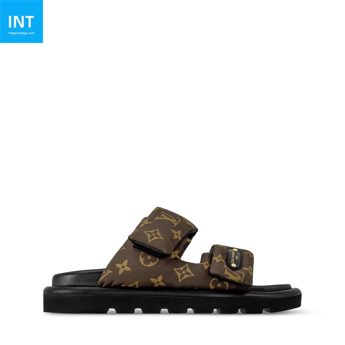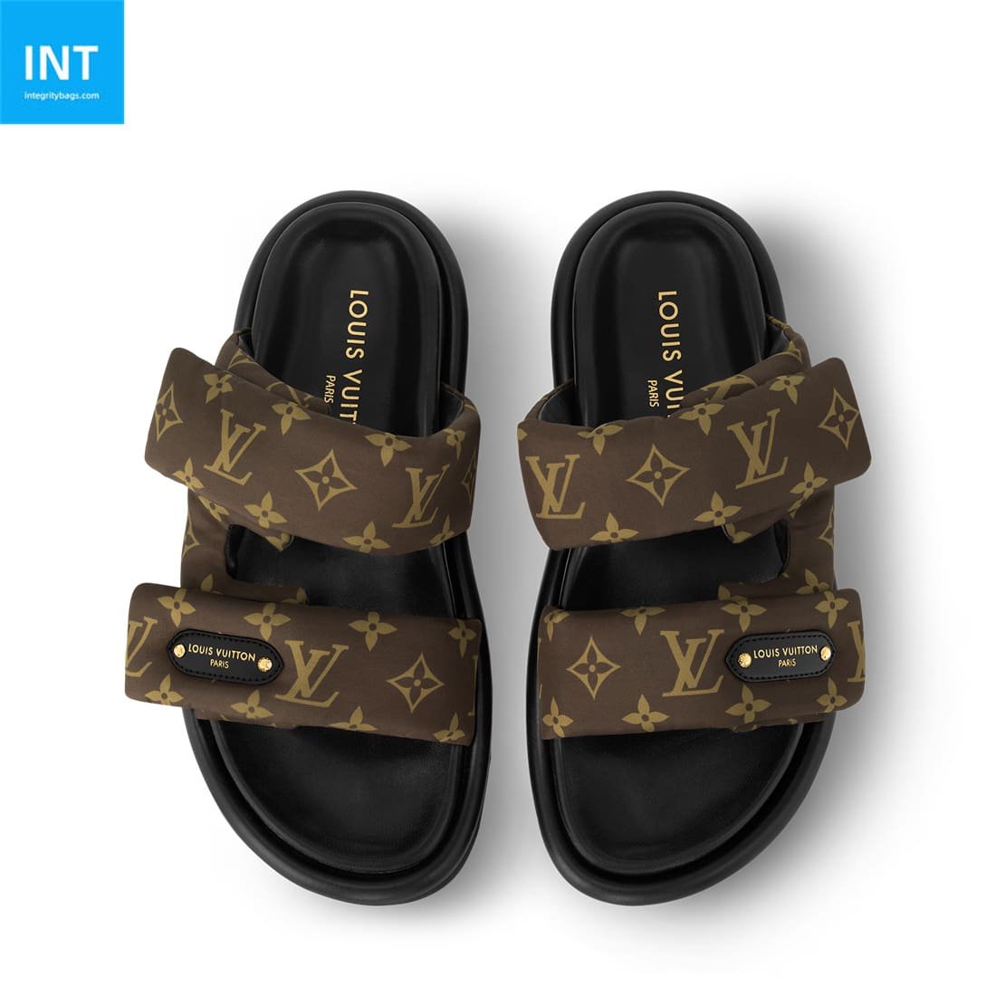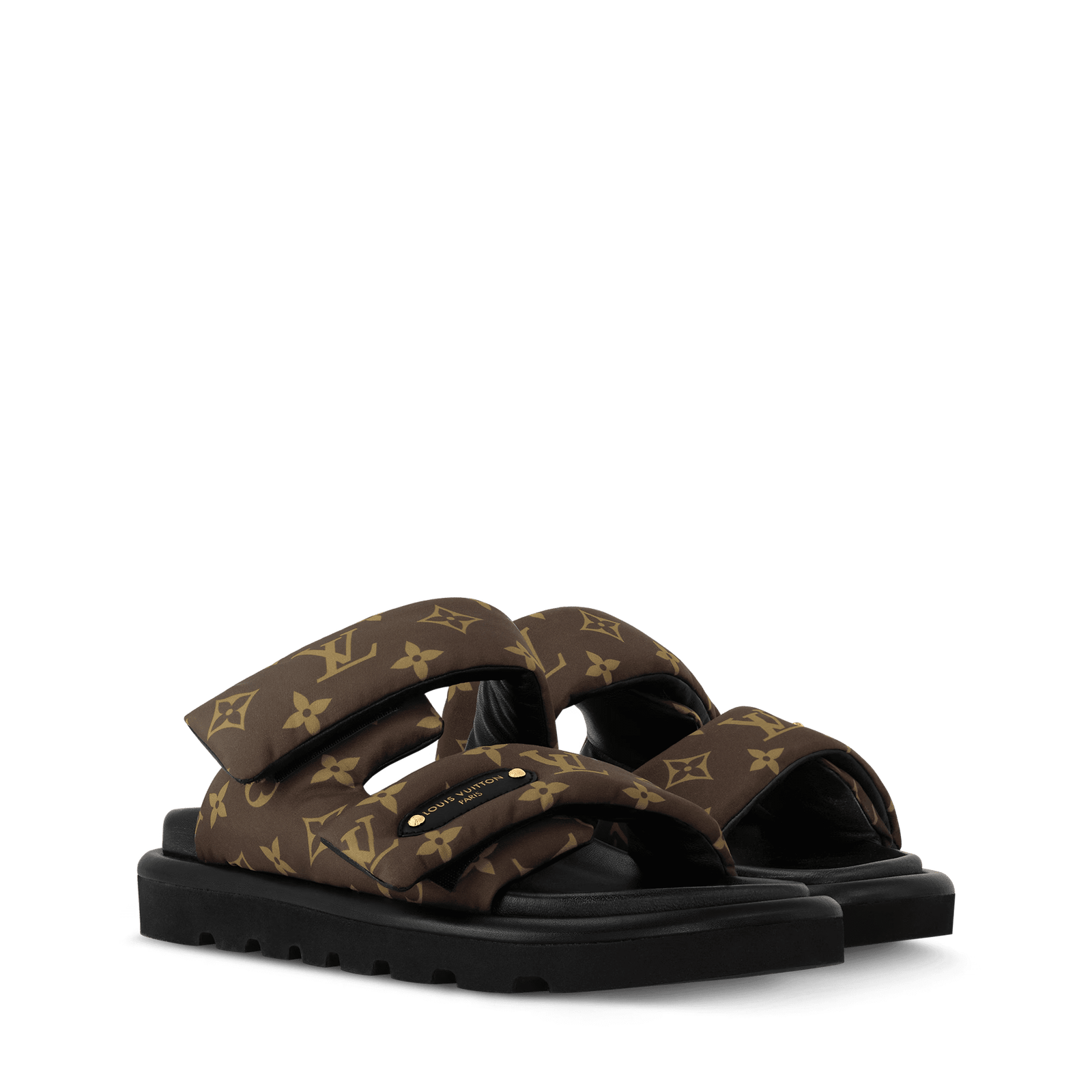 The Pool Pillow comfort mule is revisited with two padded, adjustable straps in Monogram nylon, which are lined with leather for comfort and durability. The front strap is embellished with a leather label embossed with the Louis Vuitton signature. This easy-to-wear style is finished with a comfortable anatomic footbed and a lightweight micro outsole.