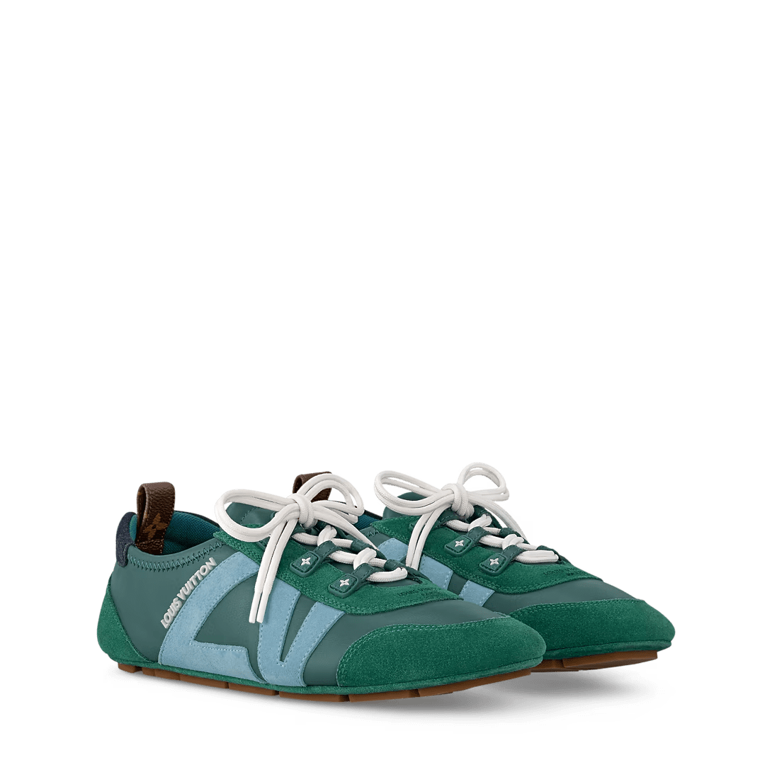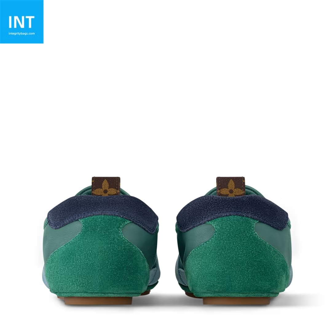 The LV Sneakerina is crafted from lambskin with trim in suede calf leather and an ultra-flexible TPU outsole. This innovative design, which can be styled with a range of looks, combines the comfort of a sneaker with the lightness of a ballerina. Key details include a prominent LV signature on the side and a back loop in Monogram canvas.