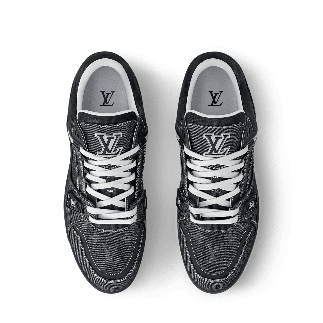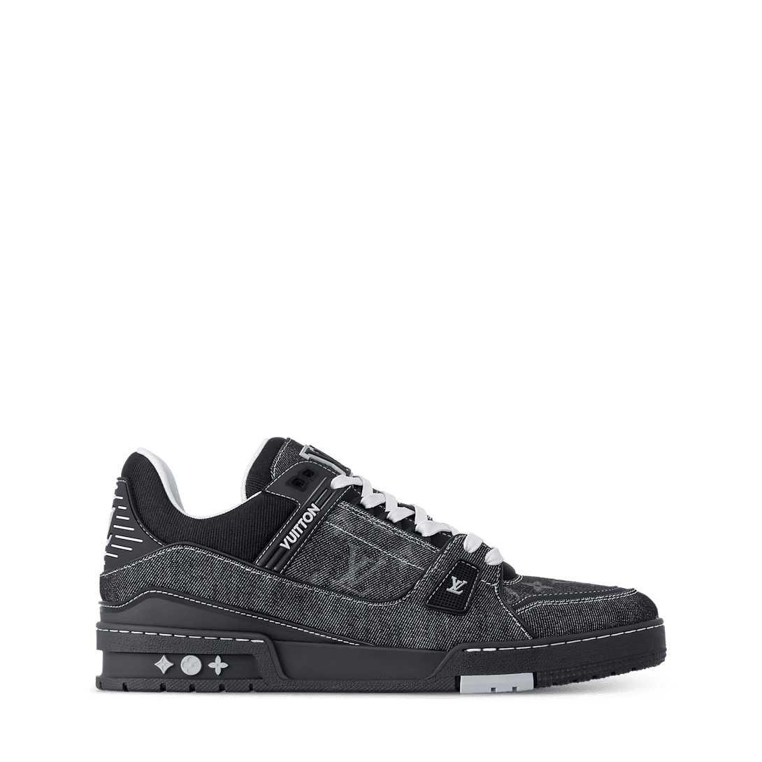 The LV Trainer sneaker is revisited in Monogram denim for a relaxed signature look. This cult design, which was inspired by vintage basketball sneakers, is notable for its elaborately constructed upper with rubber LV Initials and Vuitton signatures. It is finished with thick white laces and a two-tone rubber outsole decorated with Monogram Flowers.