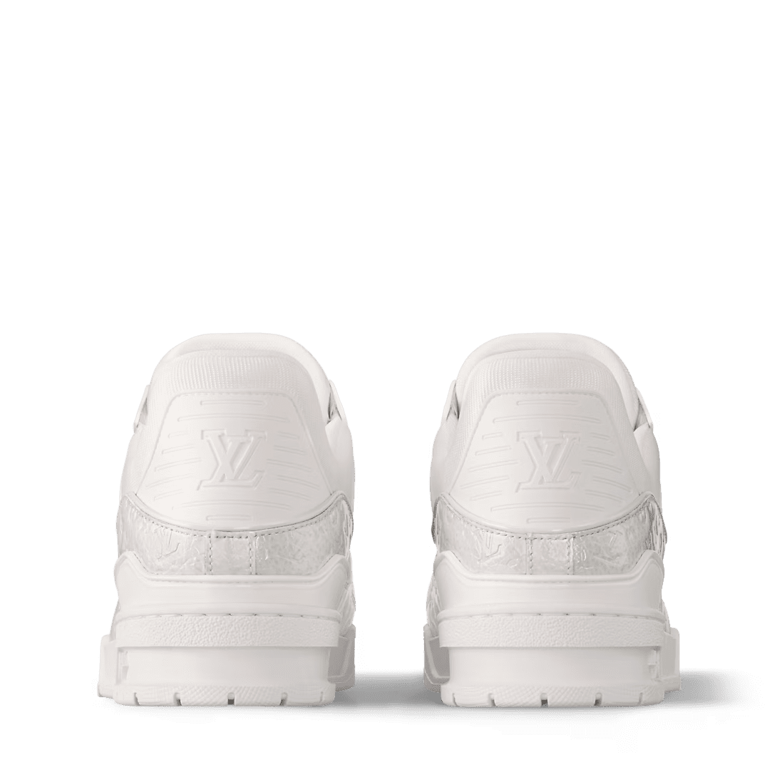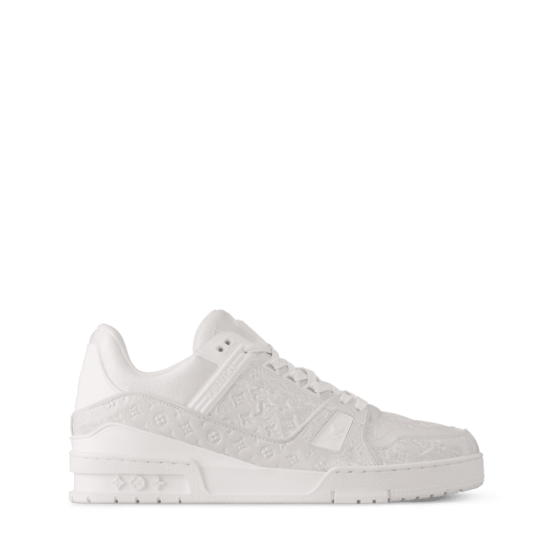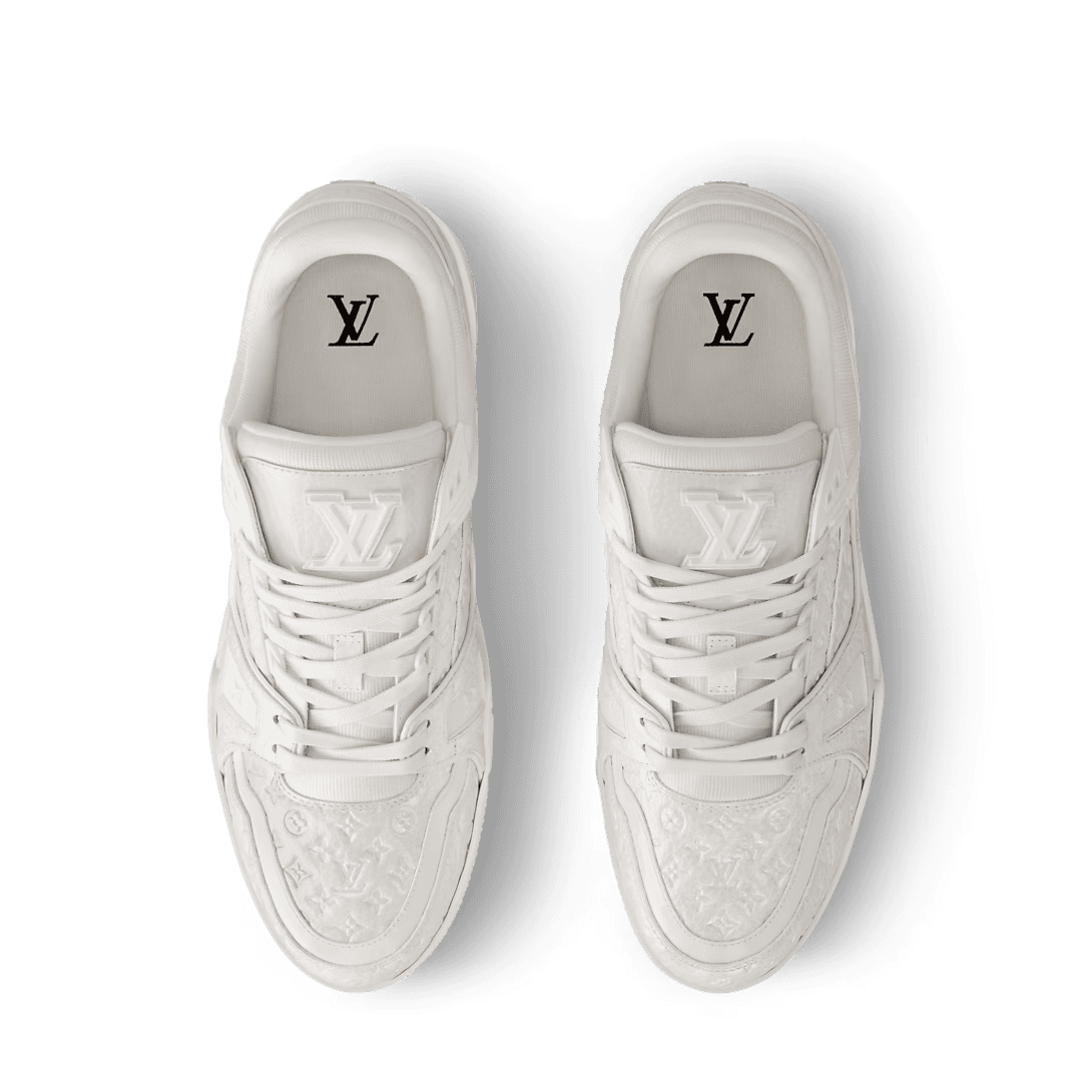 The LV Trainer sneaker is revisited in a monochrome version in high-shine patent calf leather, which is embossed with the Mini Monogram pattern. This iconic model was originally designed by Virgil Abloh, who drew inspiration from vintage basketball sneakers. The upper is characterized by contrasting rubber signatures, while the technical outsole is decorated with Monogram Flowers.
