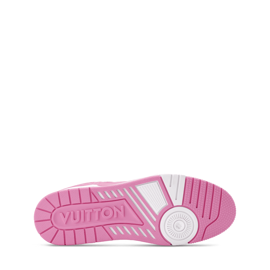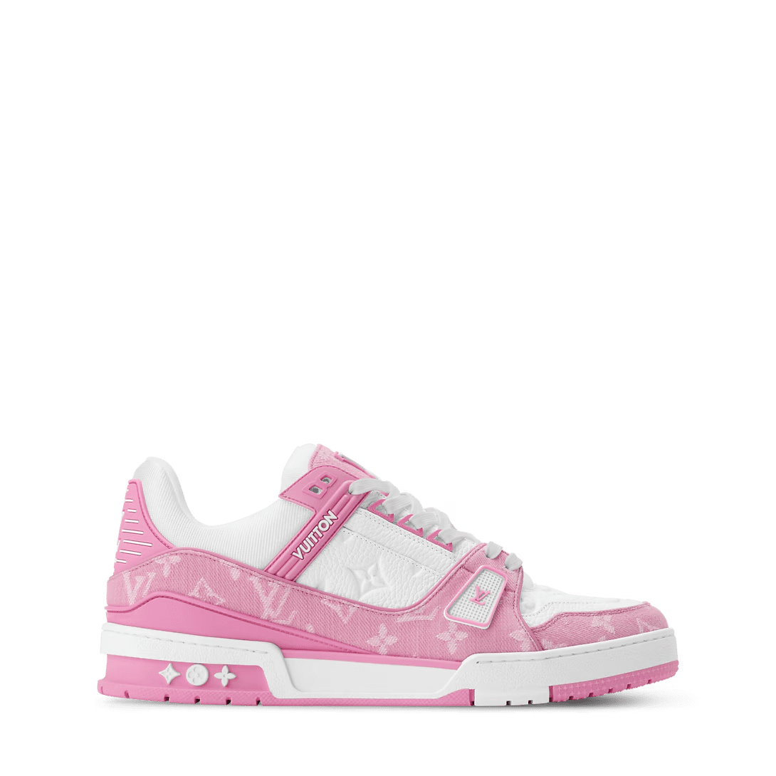 This edition of the LV Trainer sneaker combines Monogram denim with Monogram grained calf leather. The juxtaposition of two colors and two materials highlights the elaborately constructed upper of this cult sneaker, which was originally designed by Virgil Abloh. It is complemented by rubber LV Initials and Vuitton signatures and a two-tone rubber outsole.