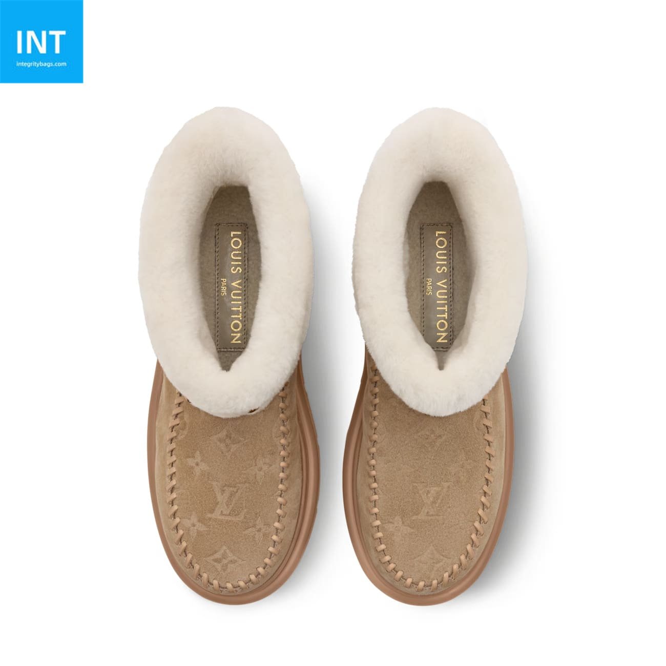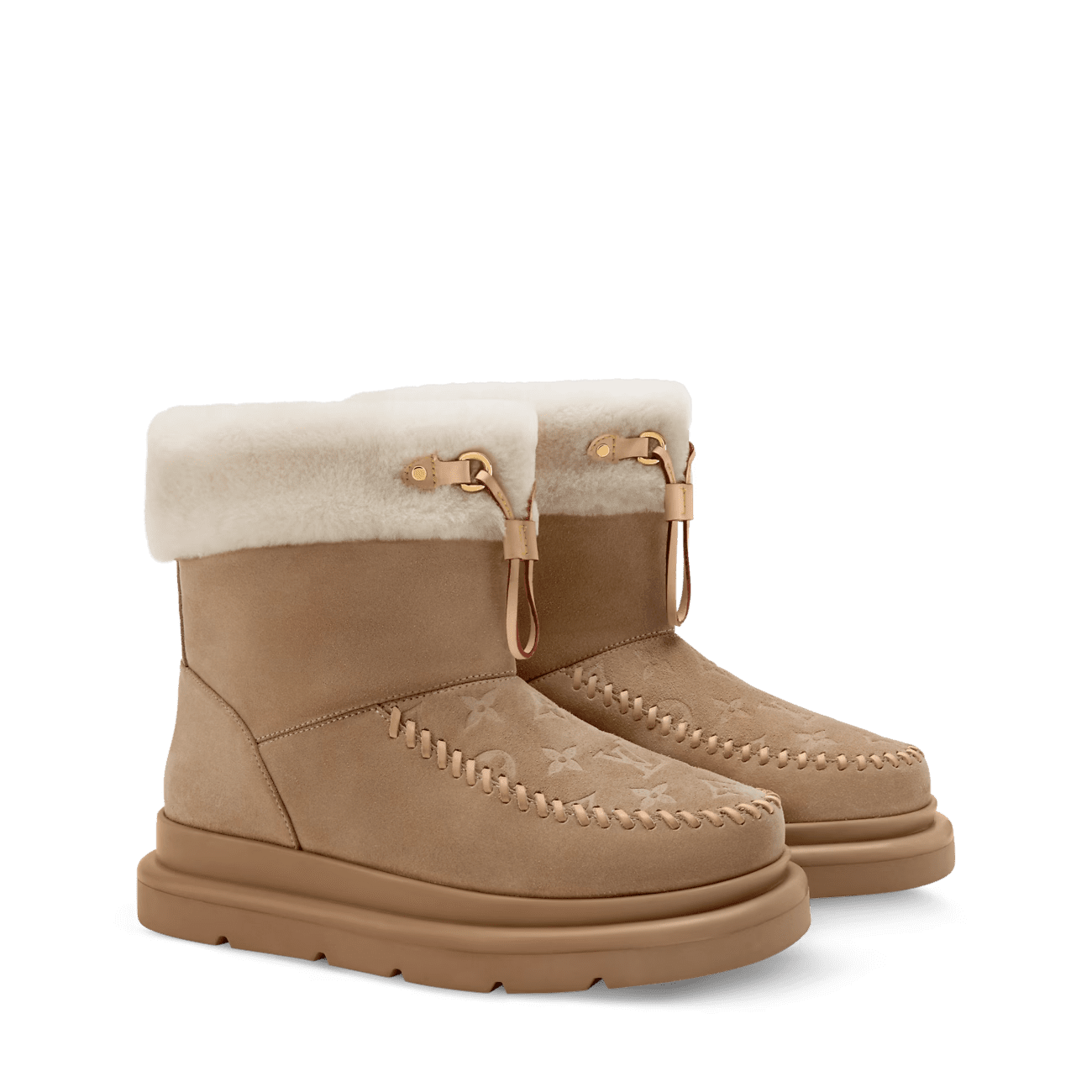 The Cortina ankle boot combines an upper in suede calf leather with a snug shearling lining. Part of the LV Ski capsule, this model is distinguished by refined signatures, including a Monogram-pattern vamp and leather laces finished with an LV Circle accessory. Perfect for both winter escapes and city life, it comes on a slip-resistant rubber outsole.