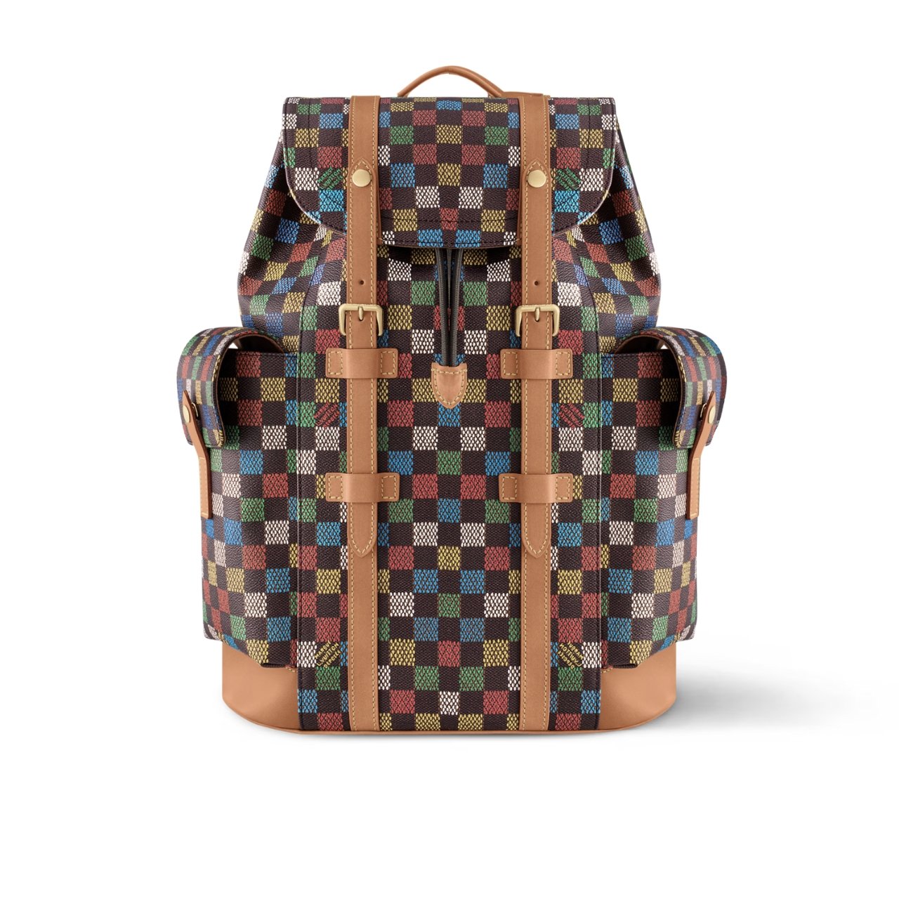 The Christopher MM backpack is fashioned from LV Vers Damier Ebene canvas. The multicolored checks on top of the Damier Ebene canvas, evoking an array of flags and the message of togetherness defined by Pharrell Williams for this collection. It is signed with a globe-shaped tag inscribed LV Vers UNITED.